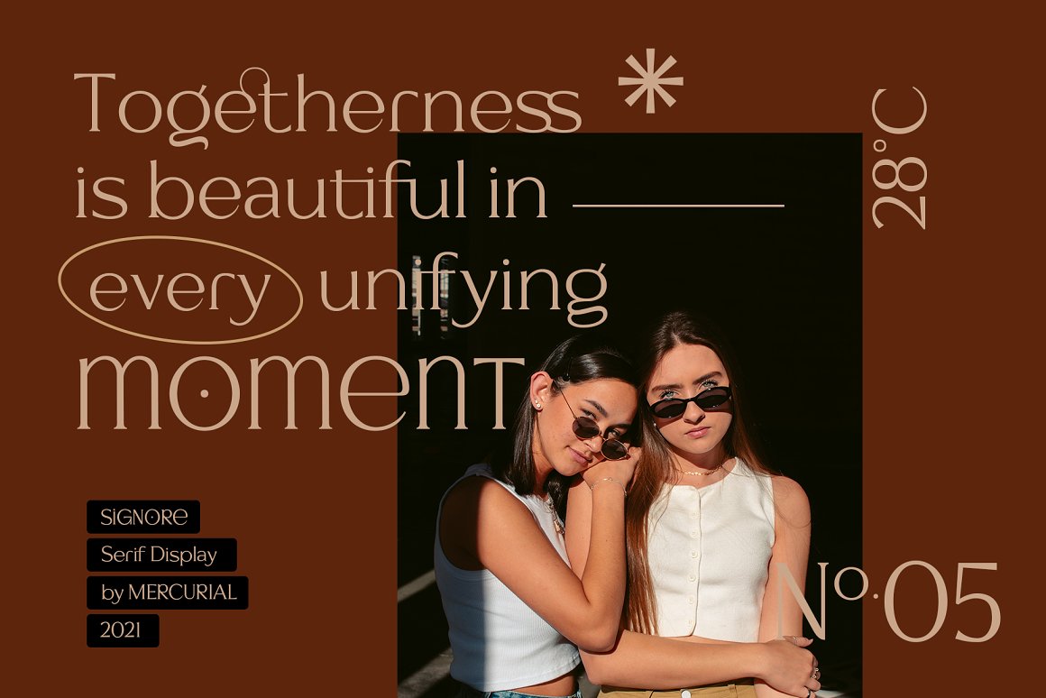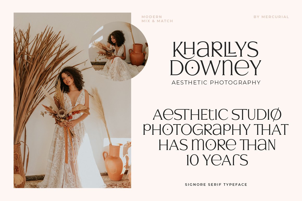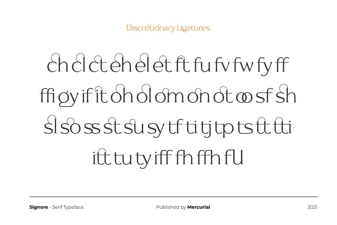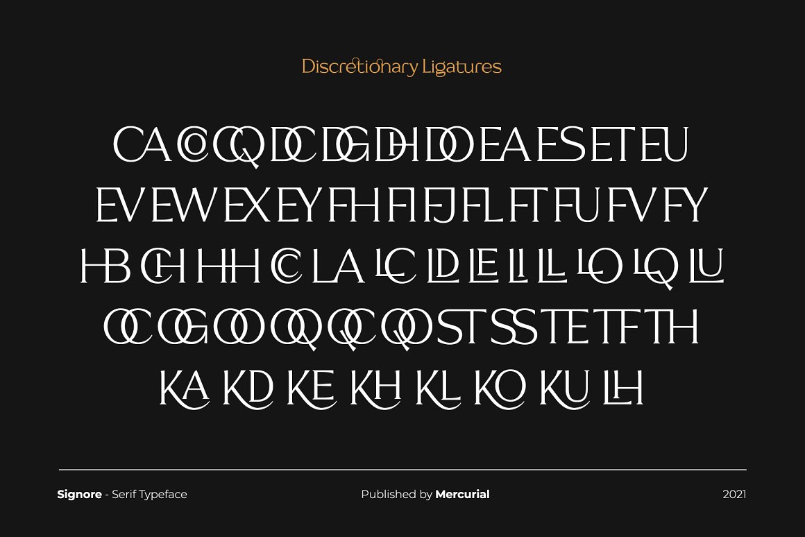 Signore is ideal for design, logo design, blog graphics, style quotes, wedding stationery, art prints, additional design, packaging, social media, magazines, fashion, creative branding, editorial design and web designing. Features a Latin character set of more than 300 glyphs covering various languages, and includes advanced open type features such as standard and discretionary ligatures, positional numbers, style alternatives, and so on.