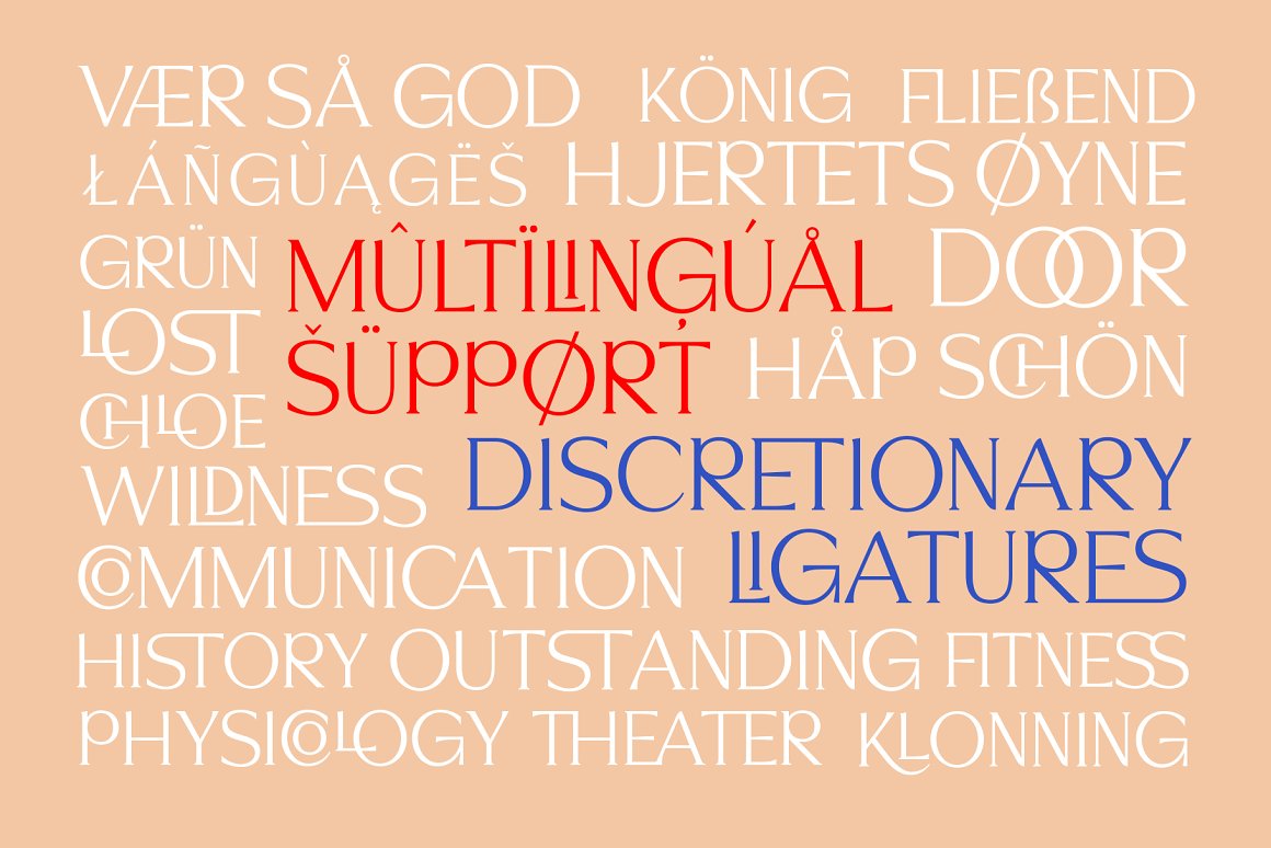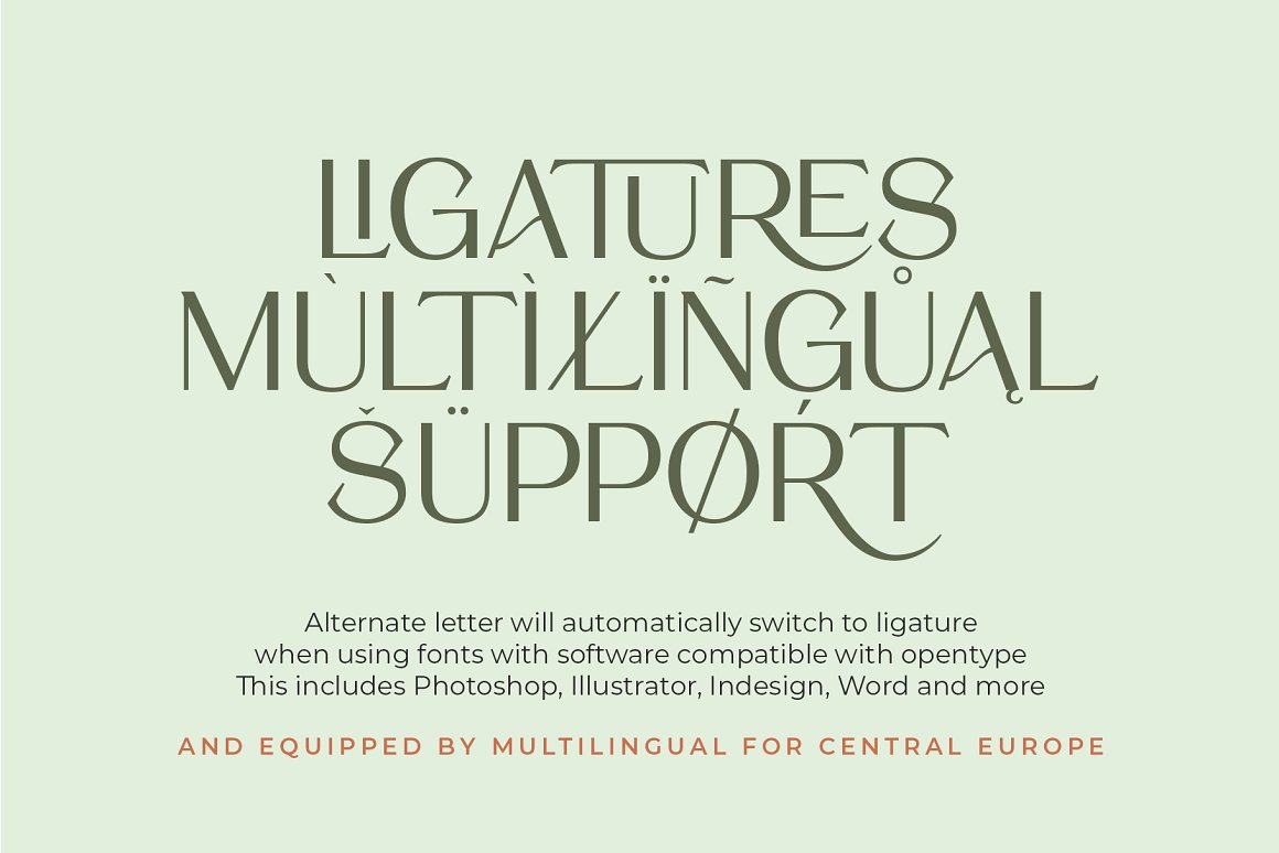 Archeology comes with full set of uppercase and lowercase letters, multilingual support, symbols, numerals, punctuation. Ligatures and many more alternates