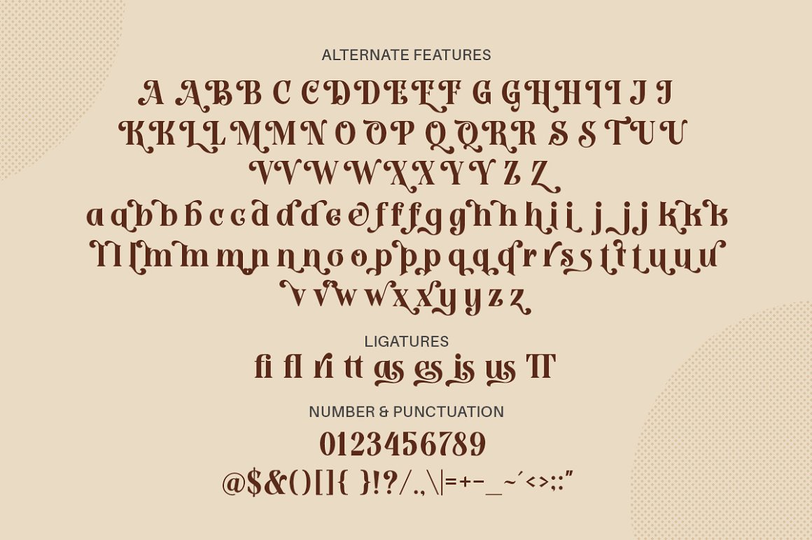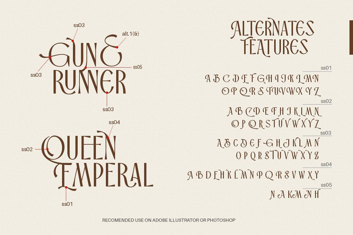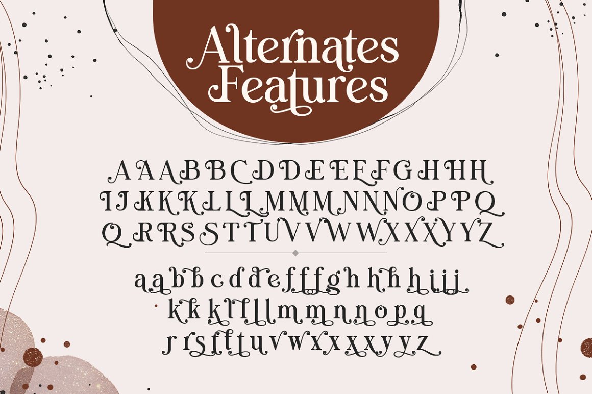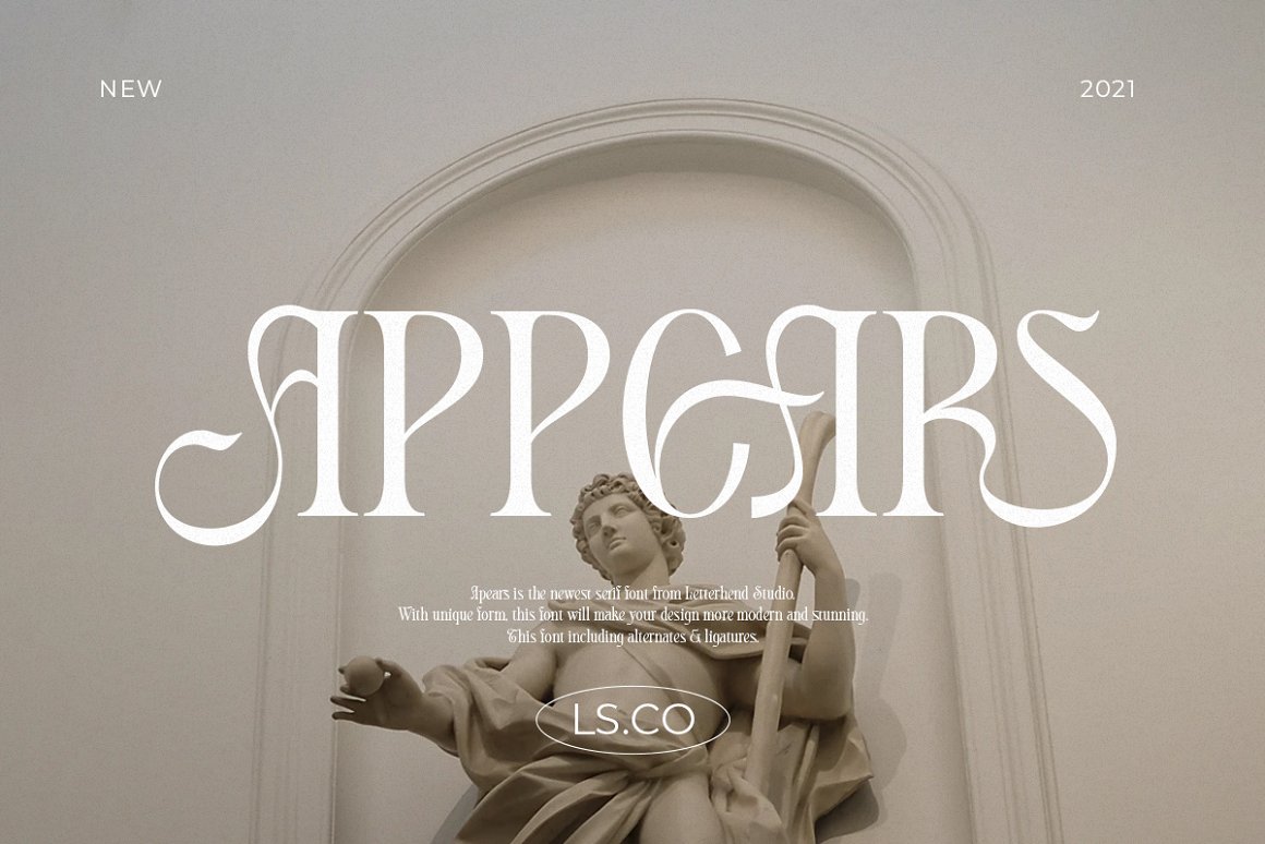 Introducing, Appears, a Display Serif Font. This font has neat and sleek letterform, make it looks great to be used for modern and minimalistic design theme. The stylistic alternates and ligatures make this font event more unique and stands from the crowd. This font perfectly made to be applied especially in logo, and the other various formal forms such as invitations, labels, logos, magazines, books, greeting / wedding cards, packaging, fashion, make up, stationery, novels, labels or any type of advertising purpose.