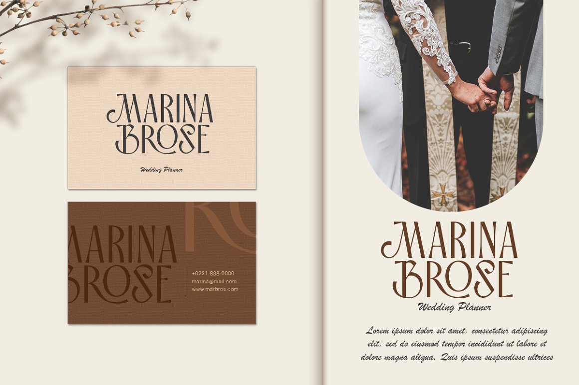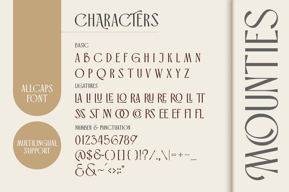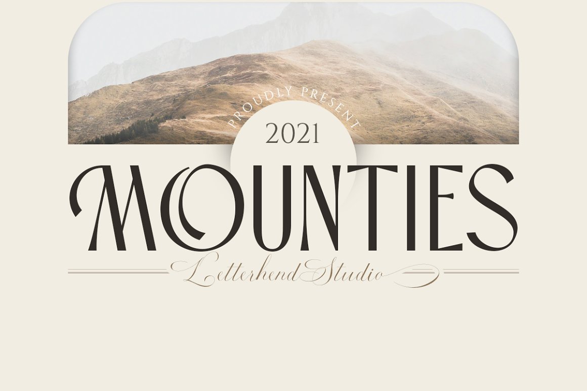 Introducing, Mounties, a Display Sans Serif Font. This font has neat and sleek letterform, make it looks great to be used for modern and minimalistic design theme. The stylistic alternates and ligatures make this font event more unique and stands from the crowd. This font perfectly made to be applied especially in logo, and the other various formal forms such as invitations, labels, logos, magazines, books, greeting / wedding cards, packaging, fashion, make up, stationery, novels, labels or any type of advertising purpose.