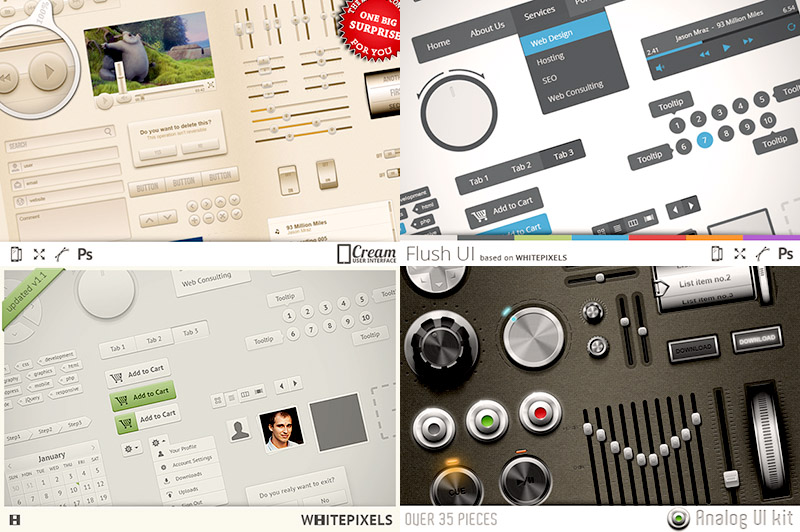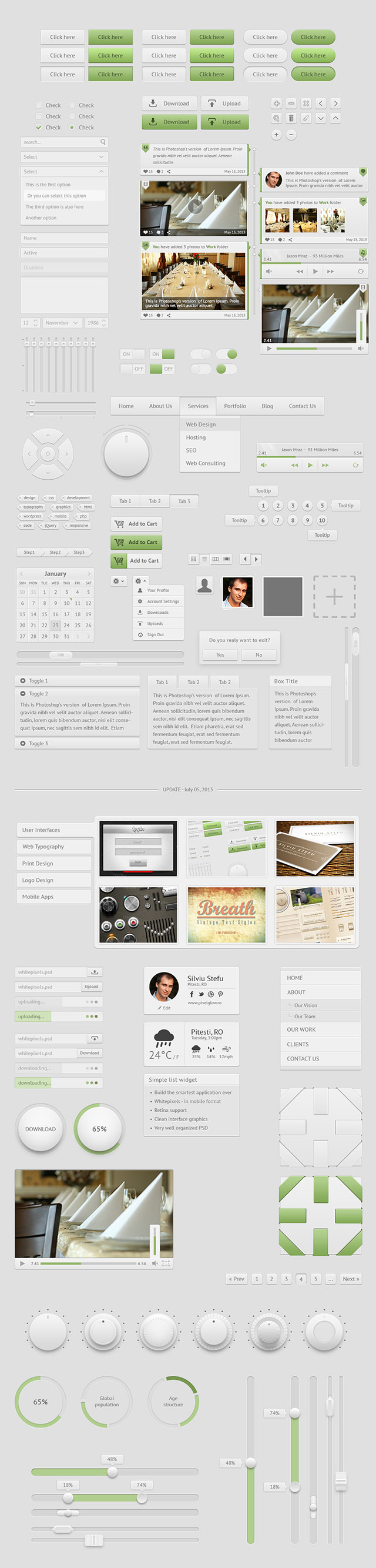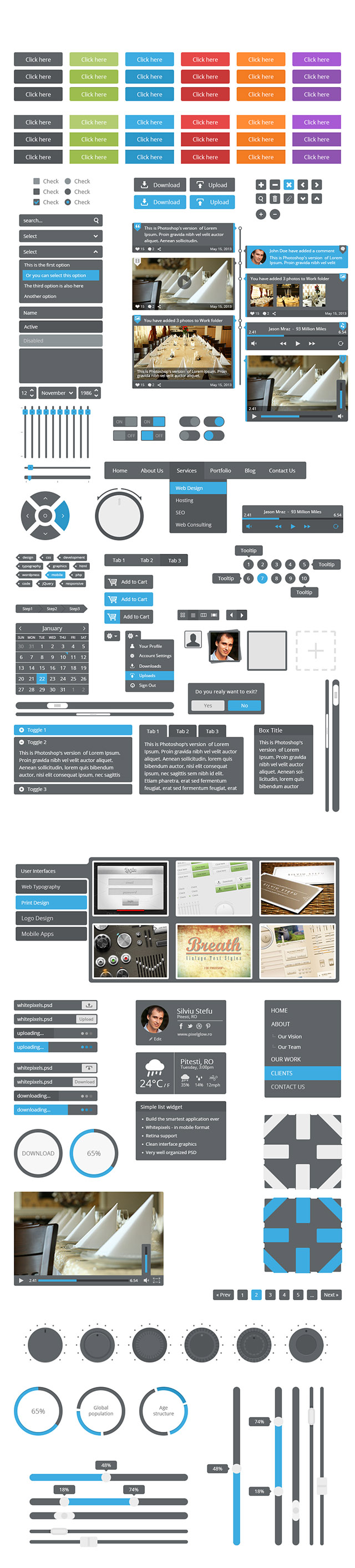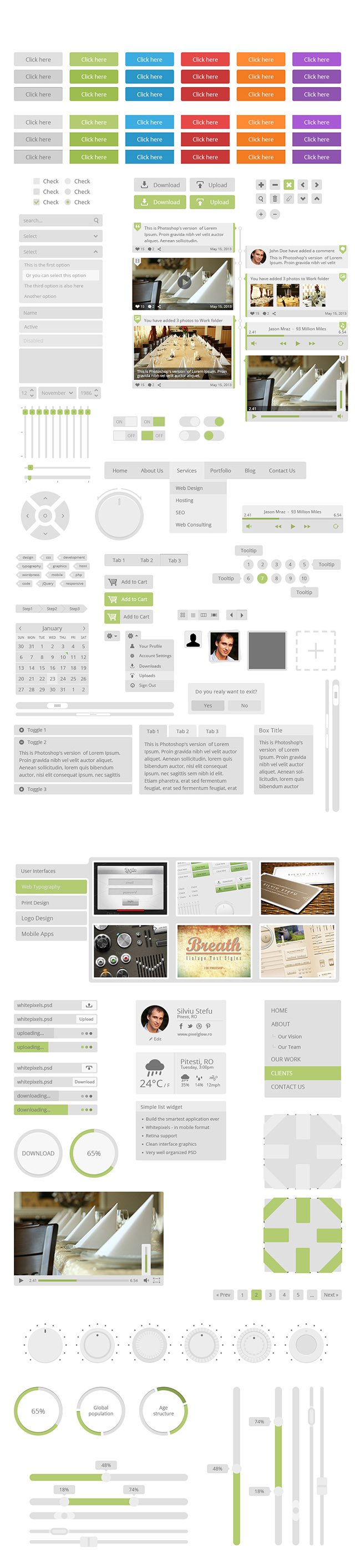 The next big thing related to the Whitepixels UI is that I want to customize this pack for mobile devices including for retina screens. So follow me and stay tuned! This is a great pack of premade graphics and web elements designed to help you create applications, great online services or websites. All elements are vector shapes so you can resize them without quality loss. The pack includes: buttons, knobs, forms, sliders, menu bar, switches, directional buttons, list selector, equalizer interface, timeline and a lot more. Every single element was designed with all my atention on details. I hope you’ll like and recommend it.