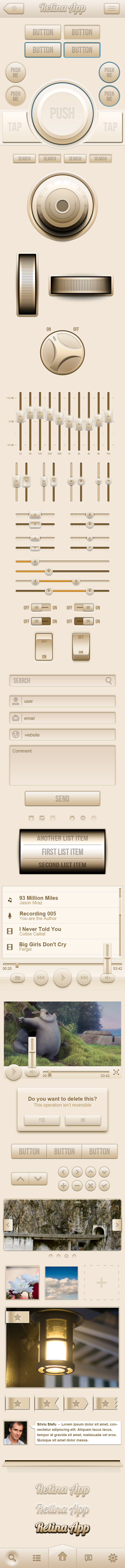 This is a great mobile UI pack designed to help you create applications for iPhone and iPad with Retina screen. You can modify all graphics and styles just as you want, and use any of included elements: buttons, knobs, sliders, image thumbnails, progress bars, shelfs, forms, checkboxes, call-to-action buttons, audio and video player, switches and a lot more… Every single button of this mobile UI pack is designed in 2 versions: normal and pressed. Also all graphics are vector. It means that you can resize every single element without losing quality.