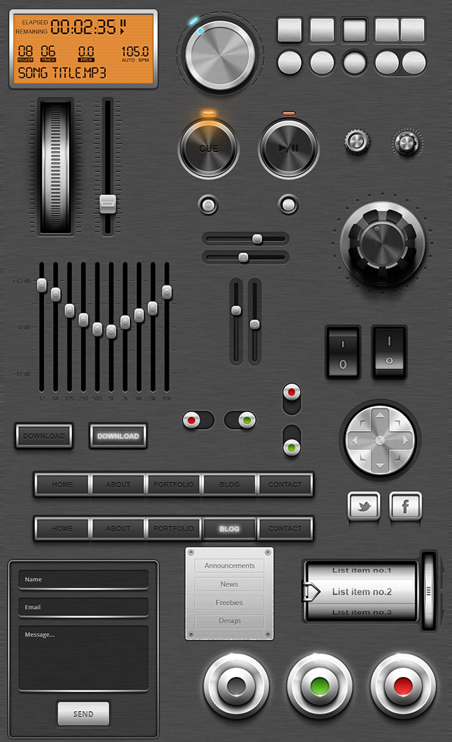 This is a great pack of premade graphics and elements designed to help you create applications, great online services or websites. Almost all elements are vector shapes so you can resize them. The pack includes: buttons, knobs, digital display, forms, sliders, menu bar with dropdown, social buttons (with bonus CSS3 animated version), switches, directional knob, list selector and equalizer interface.