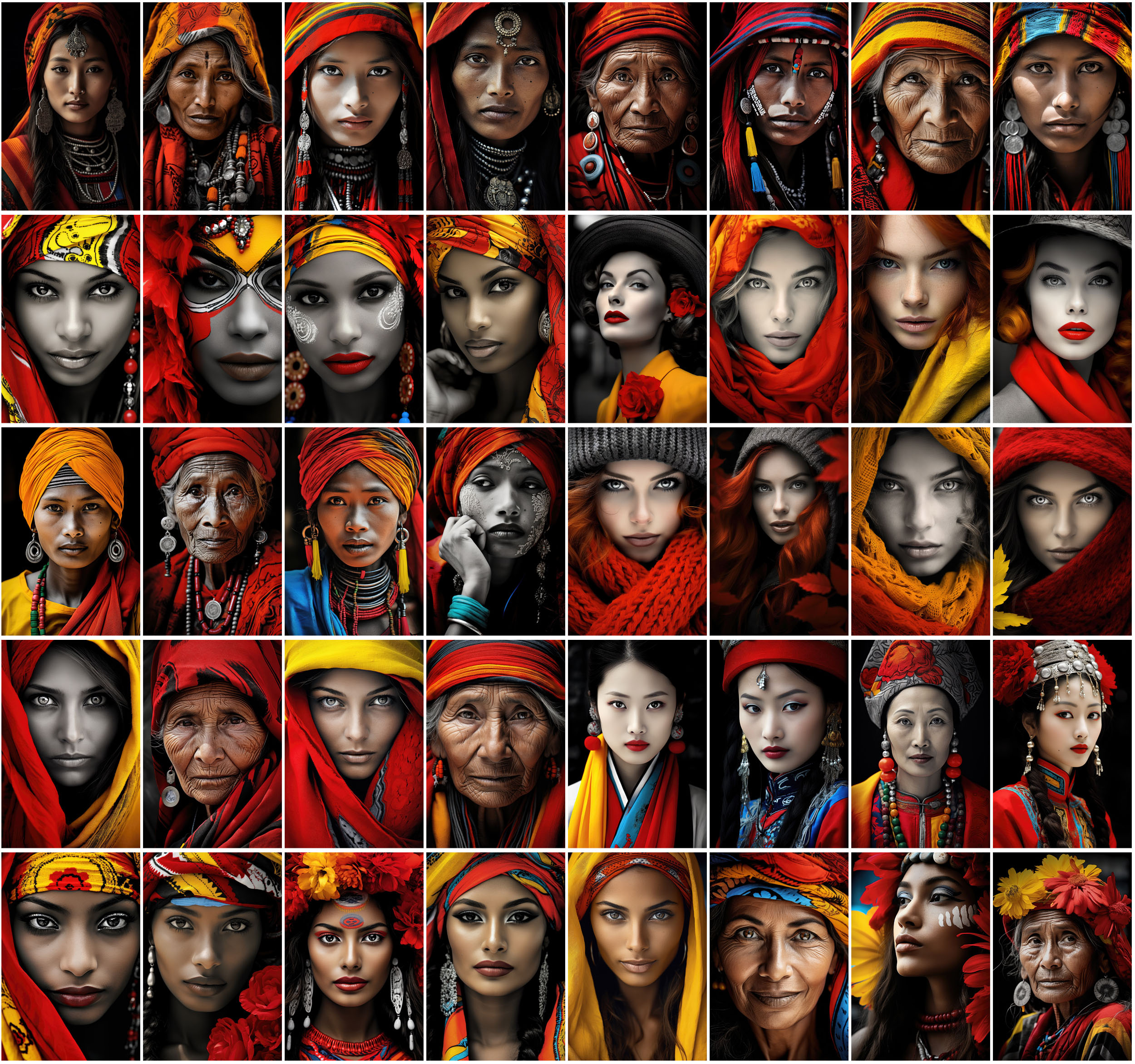 Dive into a captivating collection of close-up portraits of women from diverse countries across the globe. These 5376 x 8064 pixel images, rendered in striking selective color, offer a rich tapestry of cultures and expressions. From the vivid features of an Argentine woman to the serene gaze of a Japanese lady, each portrait is a testament to the beauty that binds humanity. Ideal for commercial use, this set includes a commercial license.