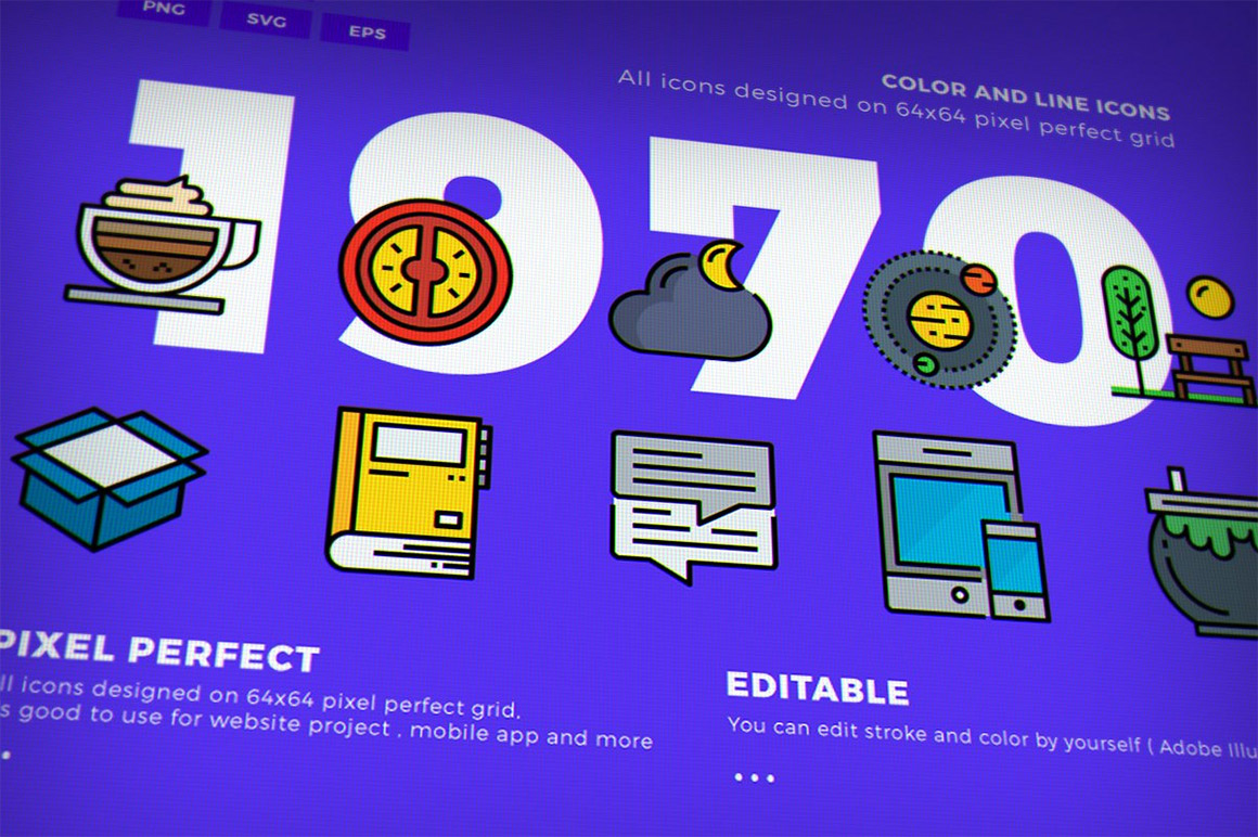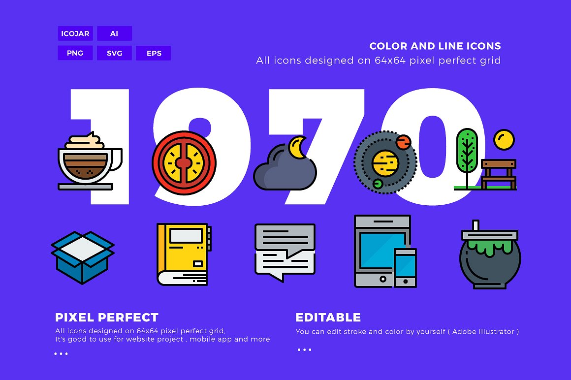 This Collection contains 1970 design of Color line vector icons. All icons designed on 64×64 pixel perfect gird, It’s good to use for website project , mobile app and more. Yes !, We hope this collection to help your Successful project.
