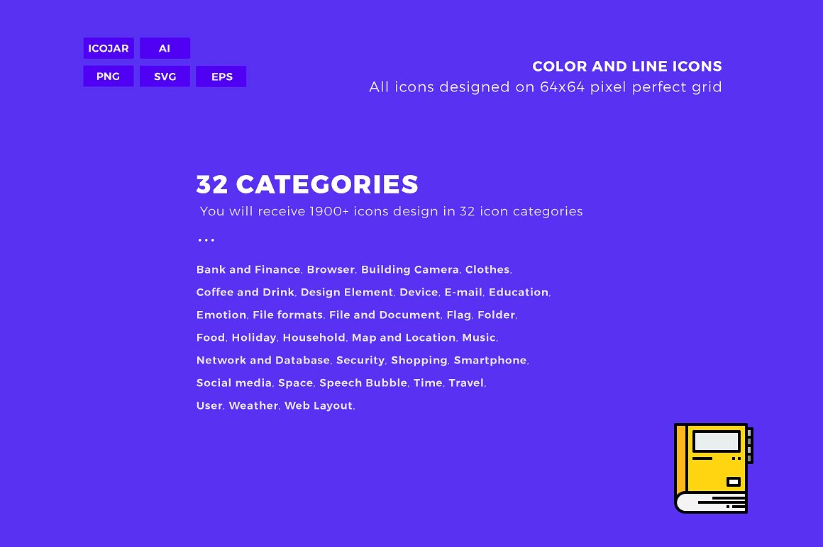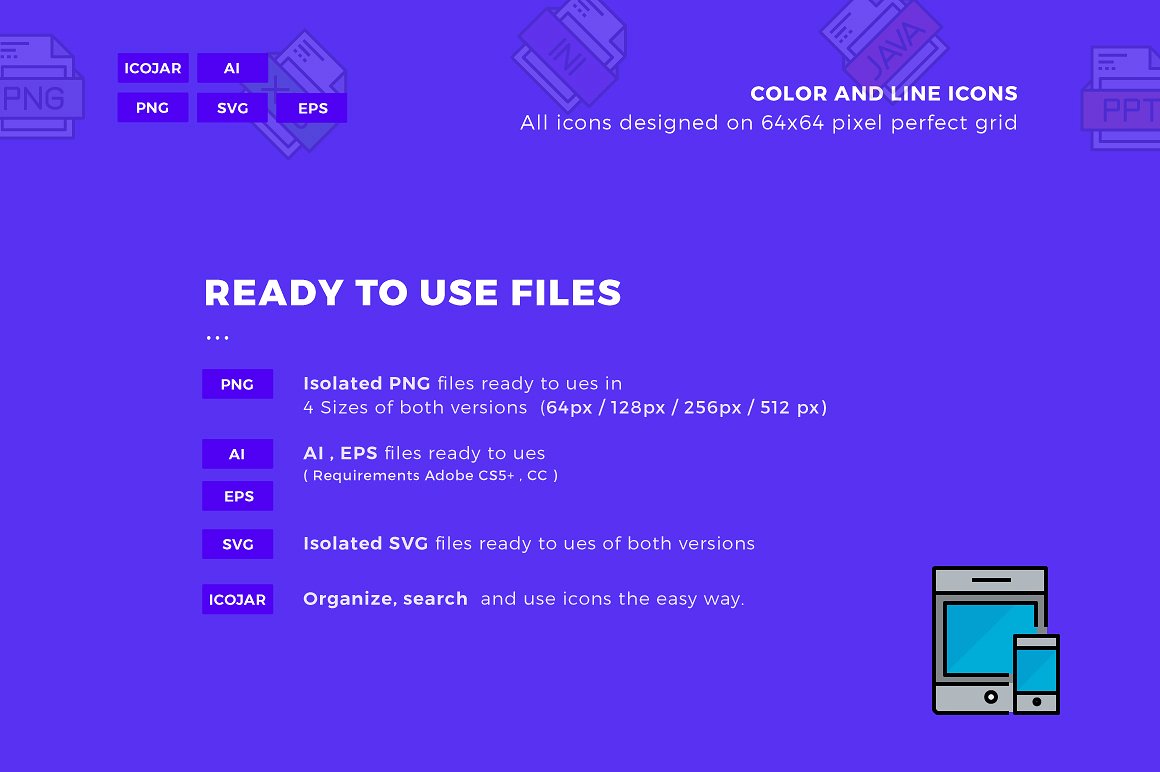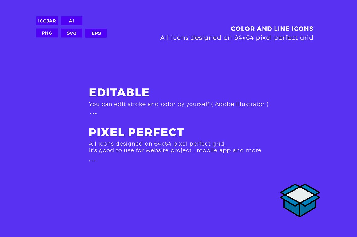 - lot of formats and sizes: AI, EPS, SVG, PNG & Iconjar