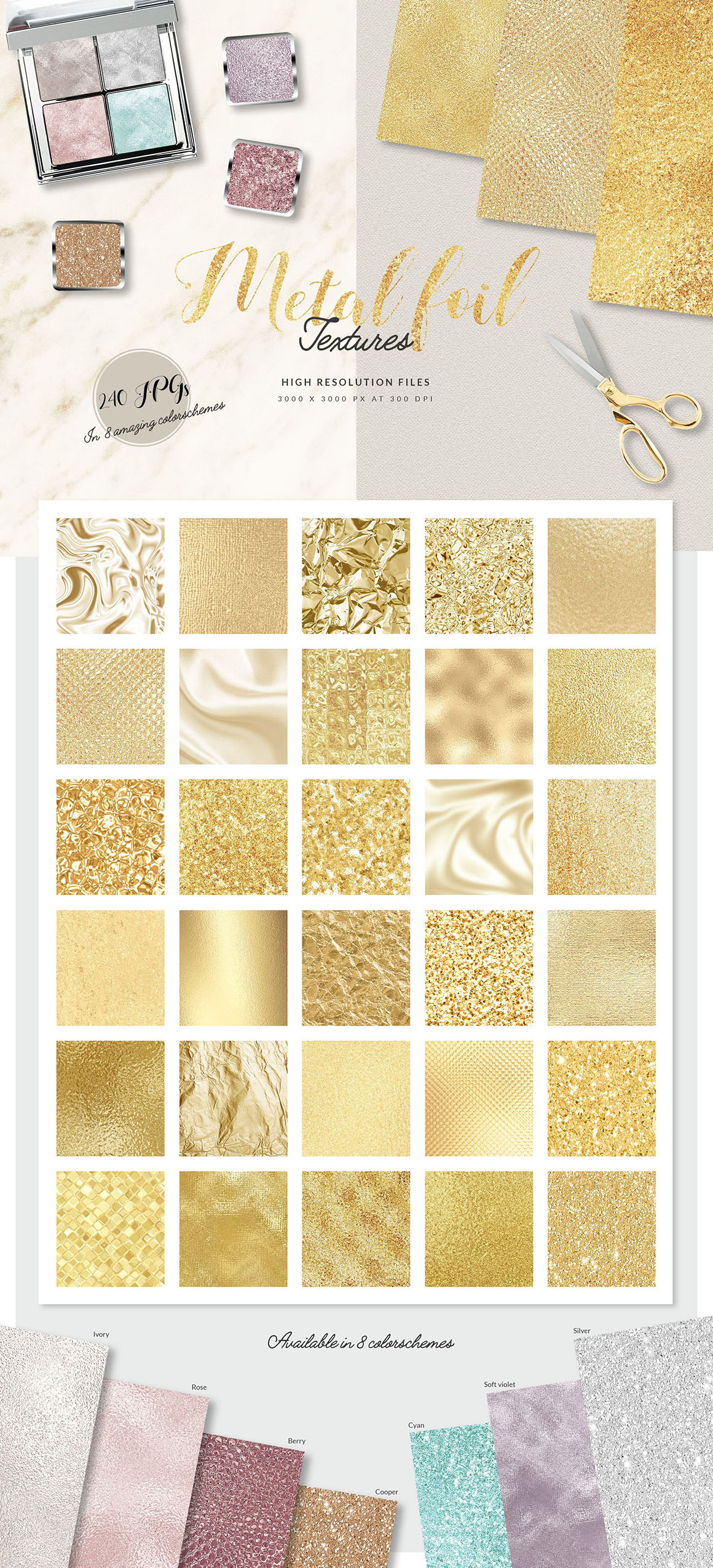 This is a huge Texture Pack including JPG files at 300 dpi (watercolor 600 dpi).It contains a lot of different styles like metal foils in 8 colorschemes, premade foil colorschemes, holographic foil and gradients (the gradients are also available in EPS and AI), marble textures and marble structures with glitter veins, glitter overlays, digital papers with foil pattern and watercolor textures.