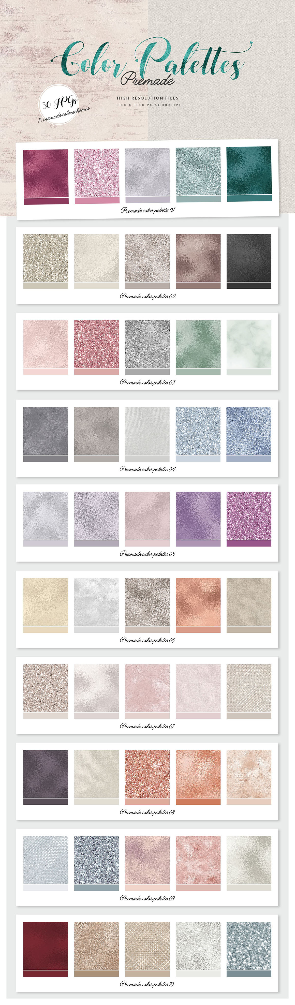 - 10 premade colorschemes with each 5 foils (in total 50 JPG files, 3000px x 3000px, 300 dpi)