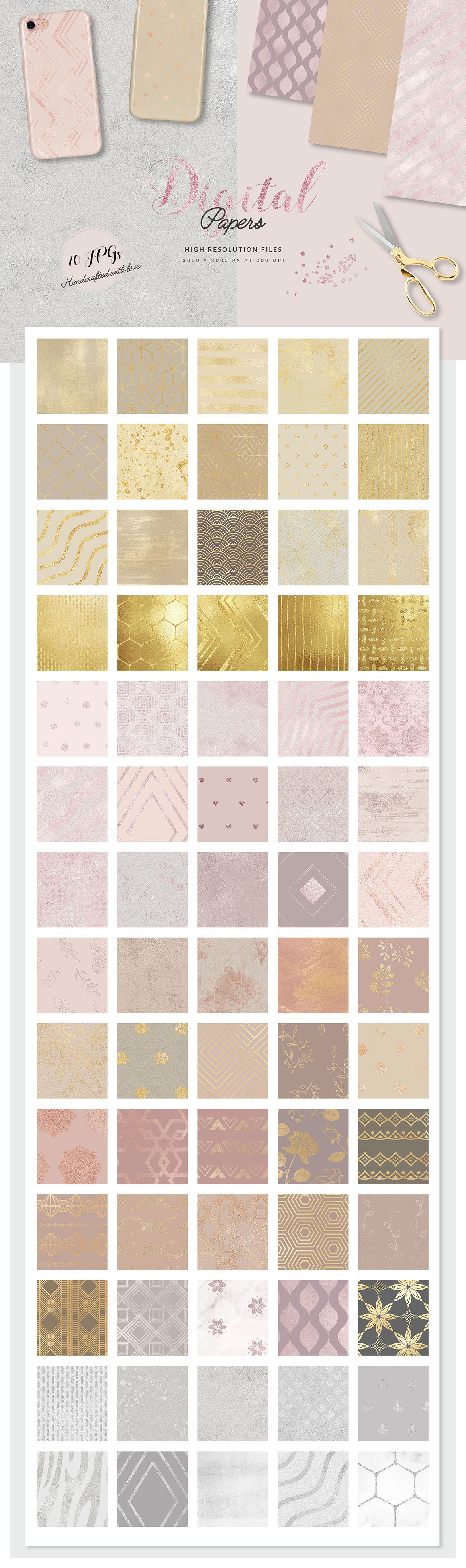 - 70 digital papers with gold, silver and rose patterns (JPG files, 3000px x 3000px, 300 dpi)