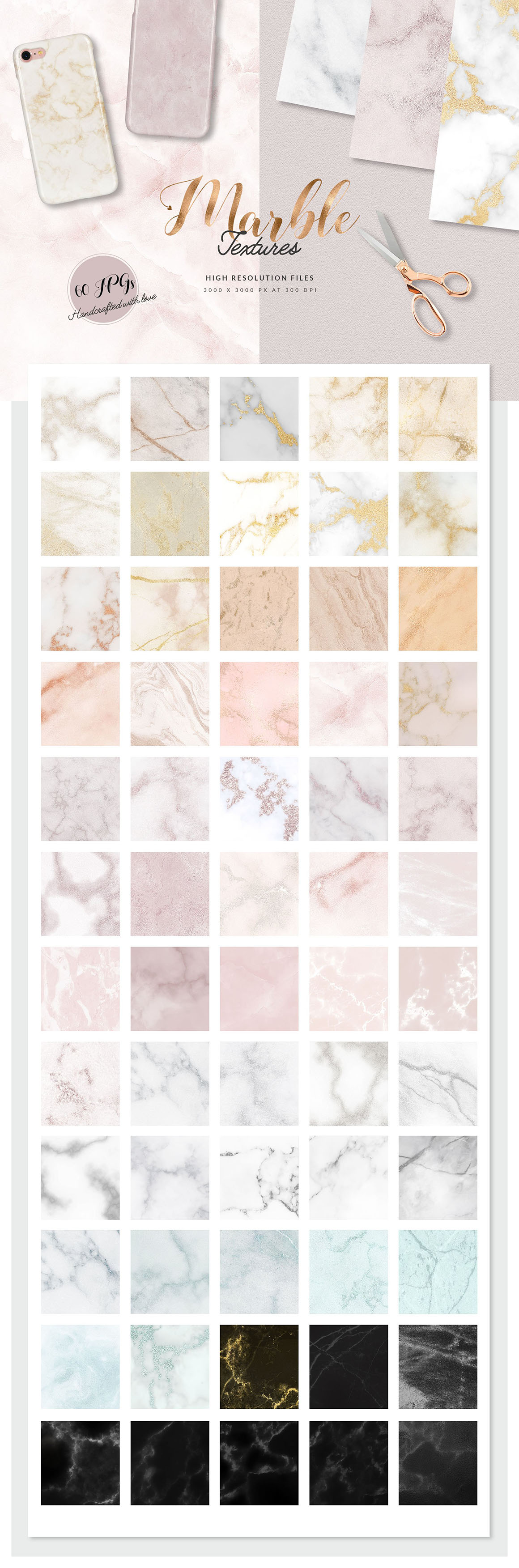 - 60 Marble textures in gray, silver, black, gold, rose and peach (JPG files, 3000px x 3000px, 300 dpi)