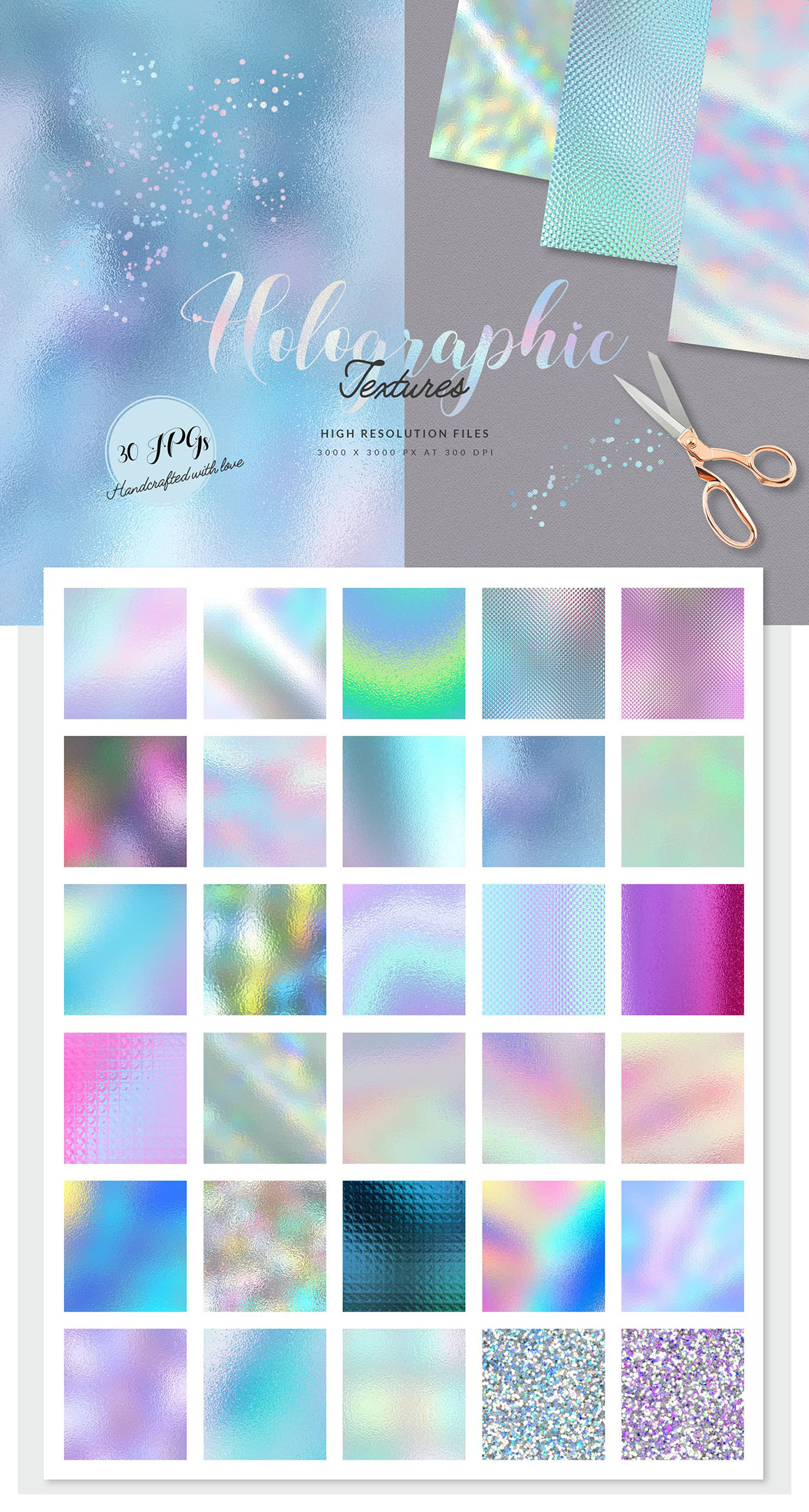- 30 amazing Holographic foils with different textures (JPG files, 3000px x 3000px, 300 dpi)