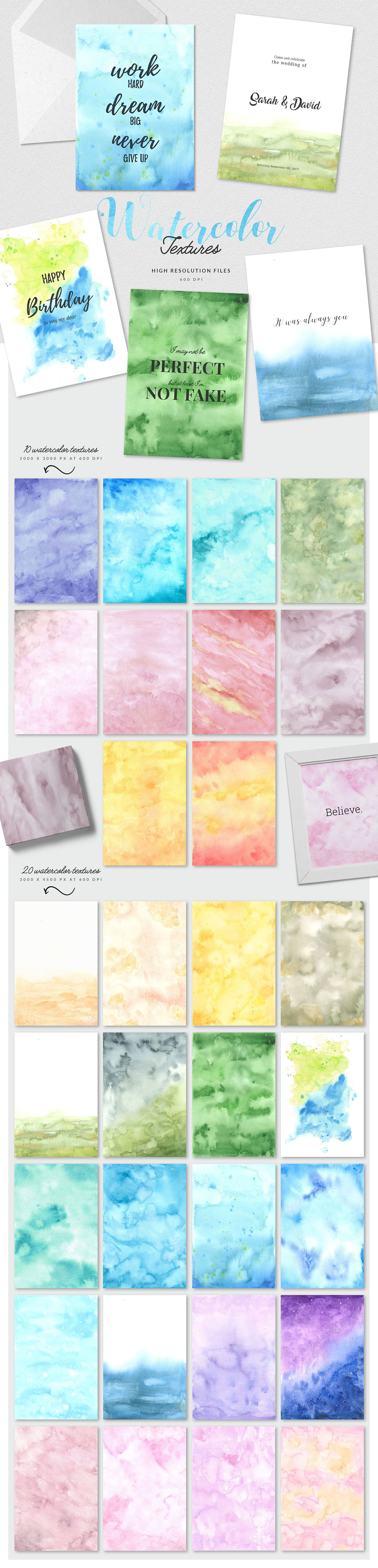 - 20 hand drawn Watercolor textures (JPG files, 3000px x 4500px, 600 dpi)