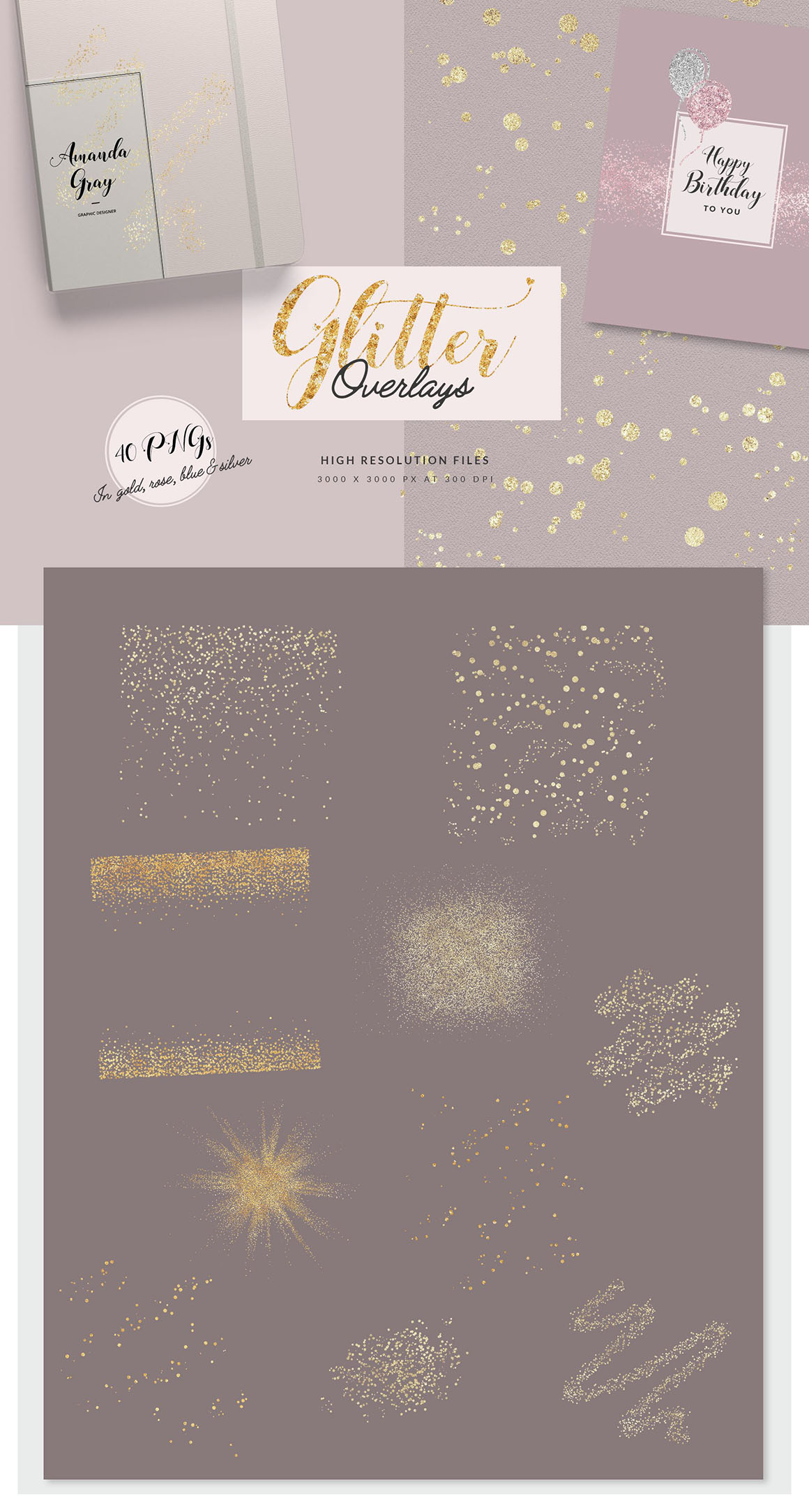 - And as bonus 10 PNGs with glitter overlays available in gold, silver, rose and blue PNG files, 3000px x 4500px, 300 dpi)