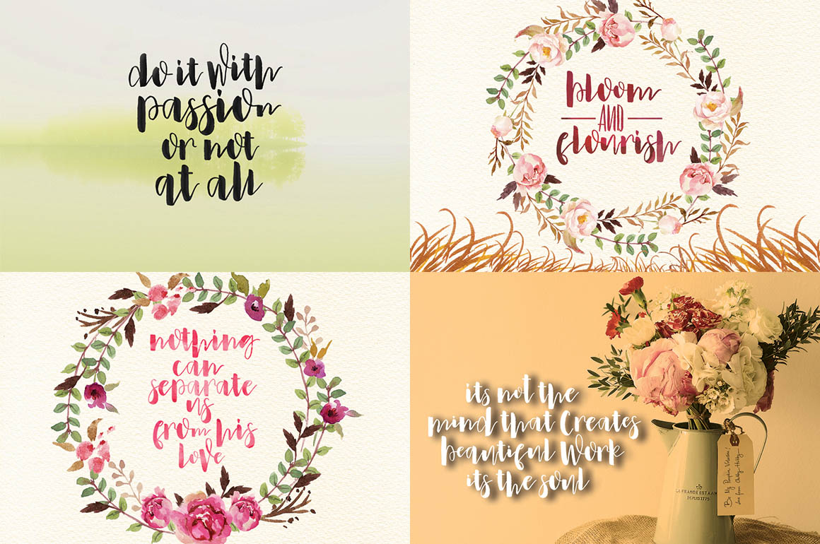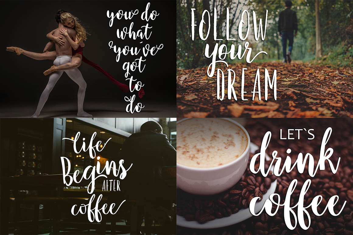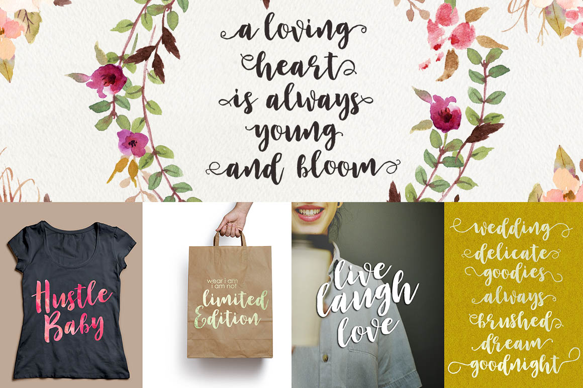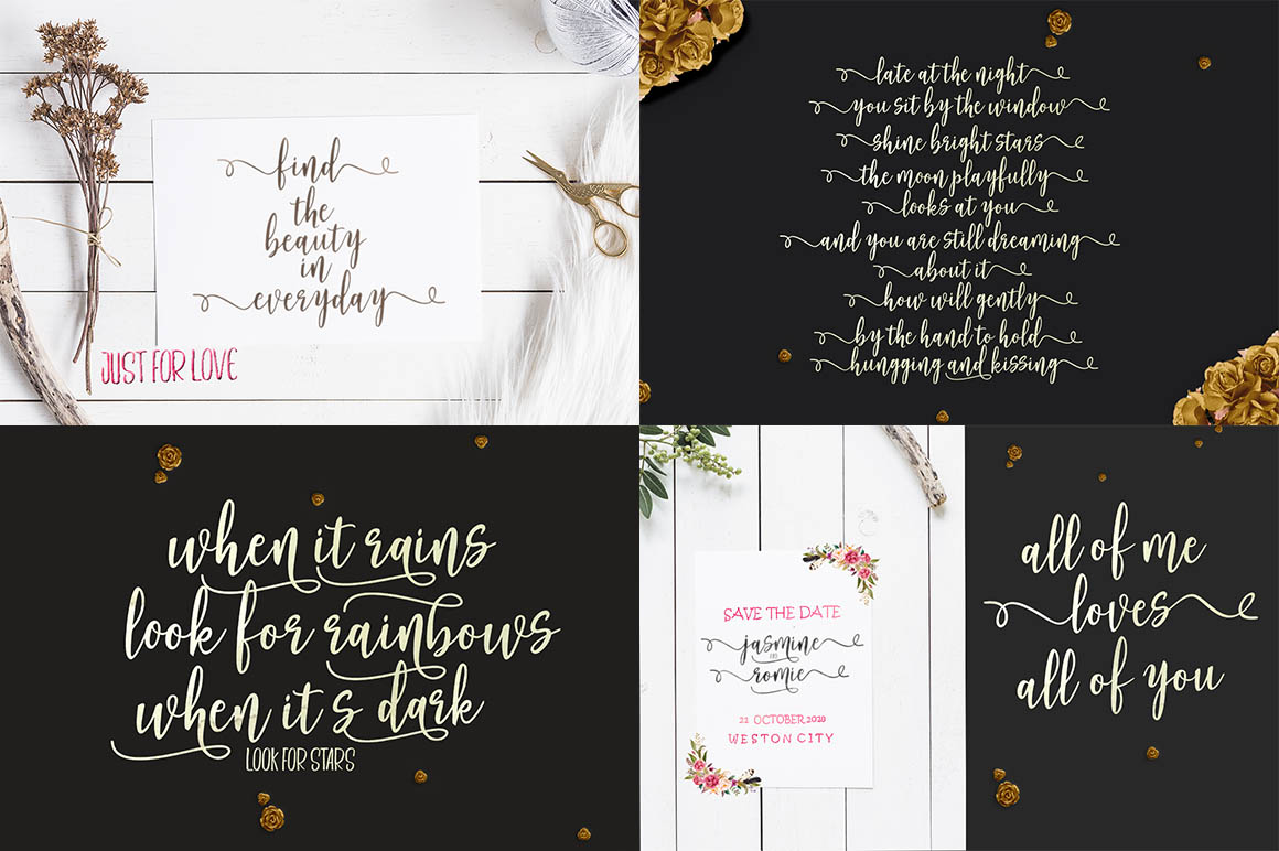 Mallica Script, Hand Lettered Calligraphy Font with beautiful waves and natural flow. has a unique letter style, with natural handdrawn, and has a softer and smoother character subtly connect all the characters. They have a simple elegant swashes in separate letters, you can use graphic design software to access the alternate letter. Mallica Script is perfect for weddings, invitations, greeting cards, quotations, posters, branding, business cards, stationary, title design, header blog, excerpts of art, the art of typography, letter envelopes modern or design books, occurred styles such as design handdrawn, title , letter marriage, pop vintage design, or purpose to make the project / art design we look beautiful and trendy. Mallica Script comes complete with 273 glyphs. This includes uppercase, lowercase, numbers, fractions, punctuation, multi-language support. and some other flying machines are variations that part of OpenType features such as, Standard ligatures, stylistic set, alternative style.