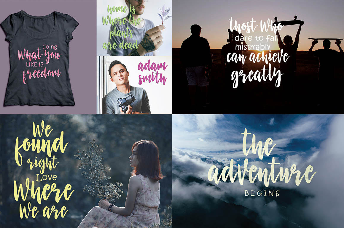 Adheana script is a hand brushed font created with a brush and ink, bold and irregular baseline. Contains a complete set of lowercase, uppercase, alternates, ligatures, punctuation, numbers, and multilingual support. And additional Adheana sans, working in harmony with Adheana script to create typography awesome creations. Get some inspiration from the preview above. Contains a complete set of lowercase, uppercase, ligatures, punctuation, numbers, and multilingual support. This font ideal for use in watercolor design or lettering style bold hand, such as blog header, posters, wedding elements, t-shirt, apparel, cover books, business cards, greeting cards, branding, merchandise, invitations and handmade quotes and more.