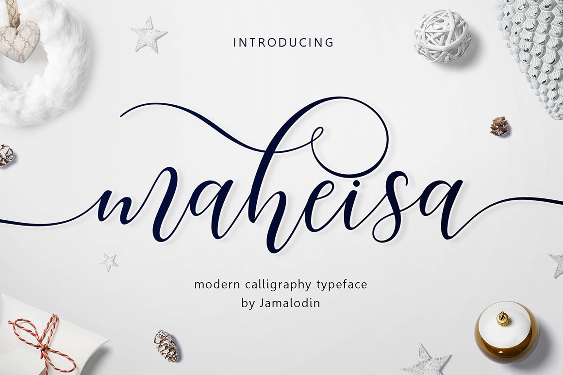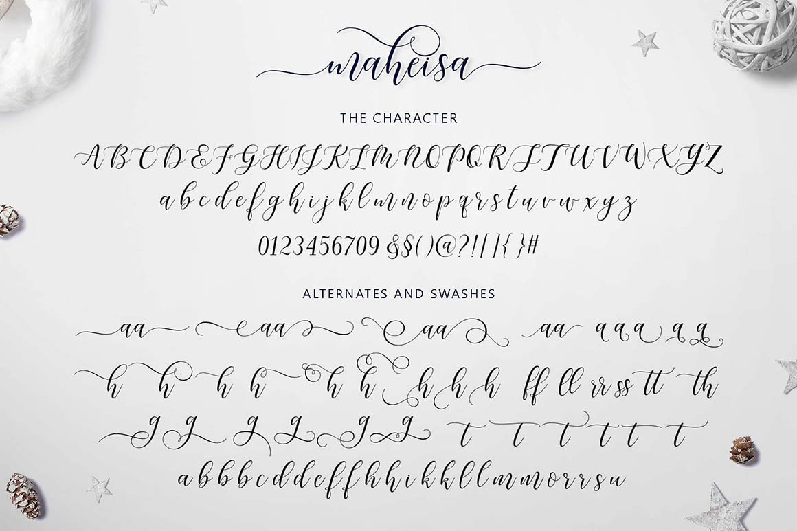 Maheisa Script is modern script font, every single letters has been carefully crafted to make your text looks beautiful. With modern script style this font will perfect for many different project, example: invitations, greeting cards, posters, name card, quotes, blog header, branding, logo, fashion, apparel, letter, stationery and more ! Maheisa Script come with 600+ glyphs. The alternative characters were divided into several Open Type features such as Swash, Stylistic Sets, Stylistic Alternates, Contextual Alternates. The Open Type features can be accessed by using Open Type savvy programs such as Adobe Illustrator, Adobe InDesign, Adobe Photoshop Corel Draw X version, And Microsoft Word. And this Font has given PUA unicode (specially coded fonts). so that all the alternate characters can easily be accessed in full by a craftsman or designer.Maheisa Script : Uppercase & Lowercase International Languange & Symbols Support Punctuation & Number PUA Unicode Range Standard Stylistic Alternates Stylistic Set 1-25 Character Variant Contextual.