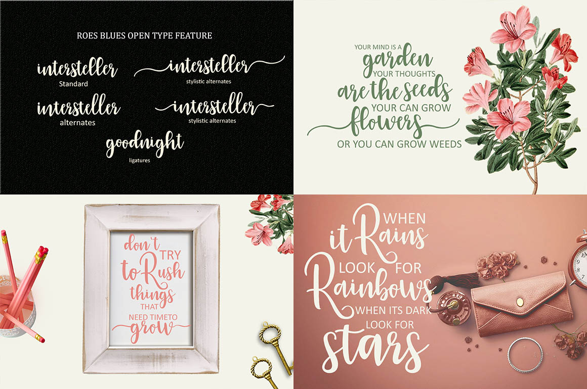 It’s an modern typeface with a tasty flow. Roes Blues Script features alternate characters, including initial,& end swashes terminal, ligatures and International support for most Western Languages is included. This one should make your designs instantly professional and jaw-dropping! Be a perfect professional in a minute and start creating modern designs like ads, sales, logos, branding, posters, social media text overlays today! To enable the OpenType Stylistic alternates, you need a program that supports OpenType features such as Adobe Illustrator CS, Adobe Indesign & CorelDraw X6-X7, Microsoft Word 2010 or later versions. and there are additional ways to access alternates/swashes, using Character Map (Windows), Nexus Font (Windows), Font Book (Mac) or a software program such as PopChar (for Windows and Mac).