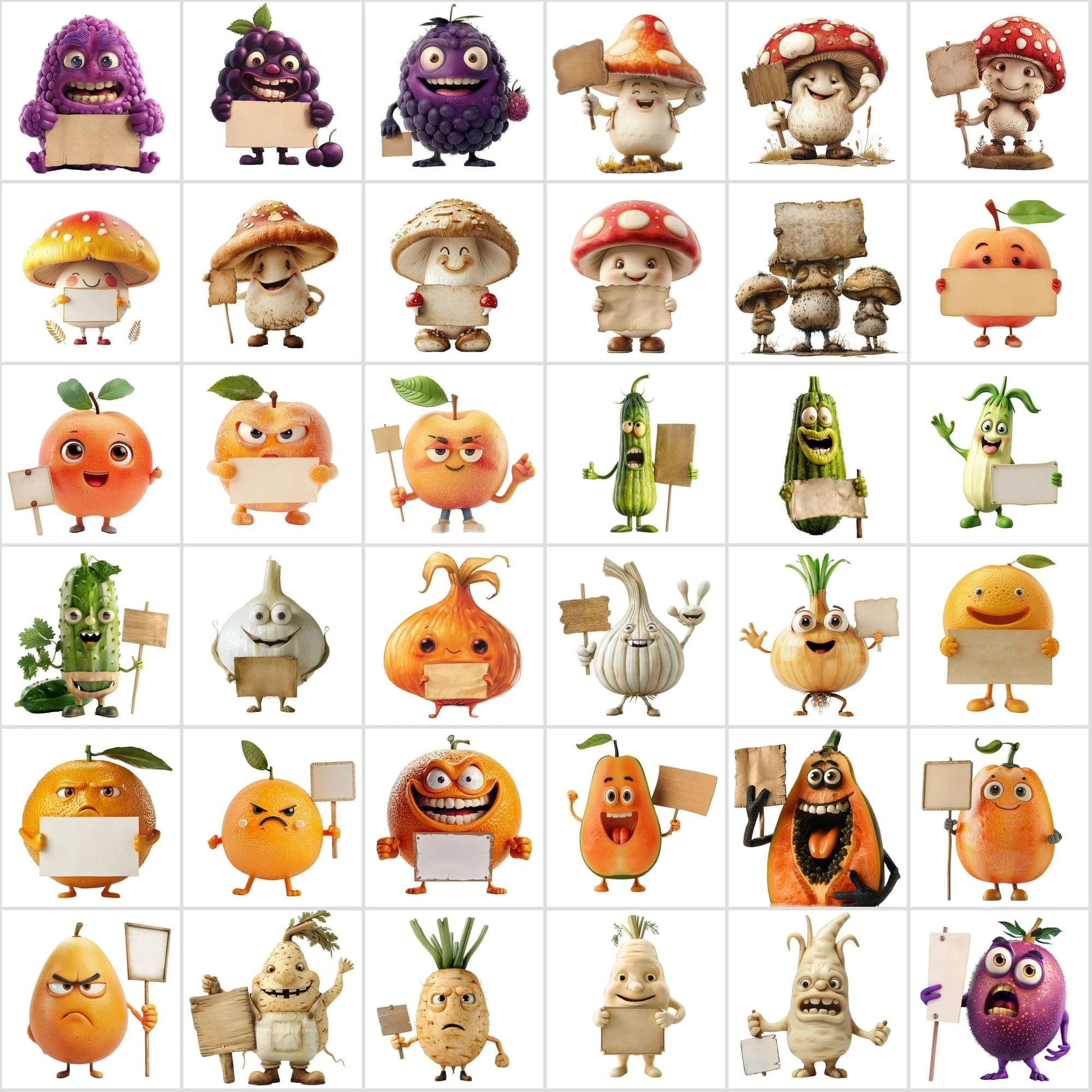 Add a fresh and playful touch to your designs with this delightful collection of 570 fruit and vegetable clipart images, each featuring charming produce characters holding blank signs. Whether you’re crafting party decorations, printables, or POD products, these high-resolution illustrations (5000 x 5000 px) are perfect for projects that need a pop of personality. Each image comes in both transparent PNG format for seamless design integration and JPG with subtle shadows for added depth. With a Commercial License included, you’re free to customize and use these adorable characters in both personal and professional creations. Ideal for adding custom messages, names, or branding, these sign-holding fruits and veggies are a fun and versatile resource for any creative toolkit.