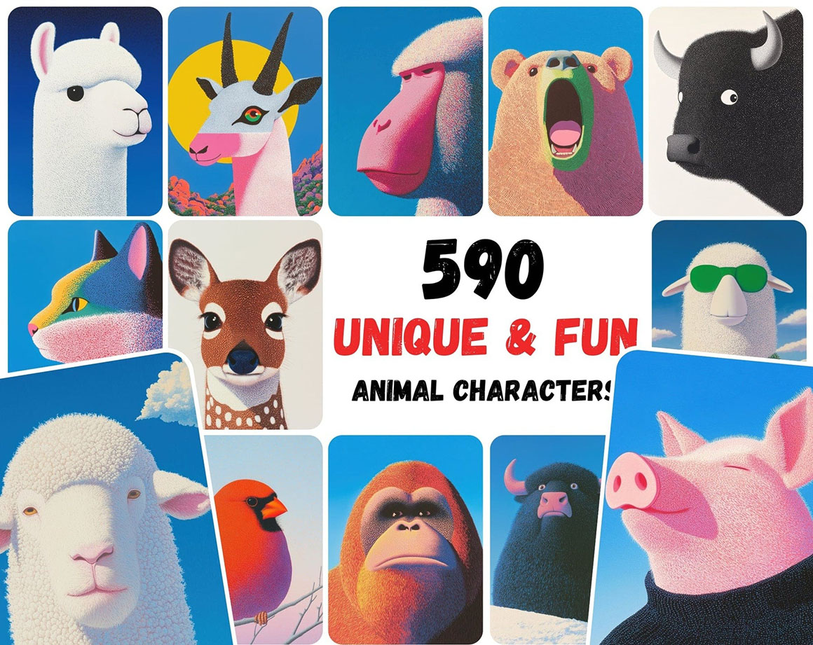 - 590 Unique Animal Illustrations: From adorable llamas to colorful birds, each character is uniquely designed to add a playful touch to your work.