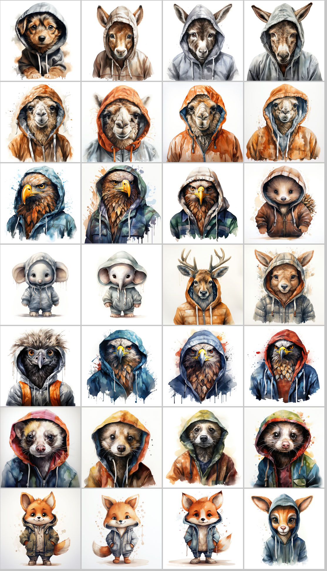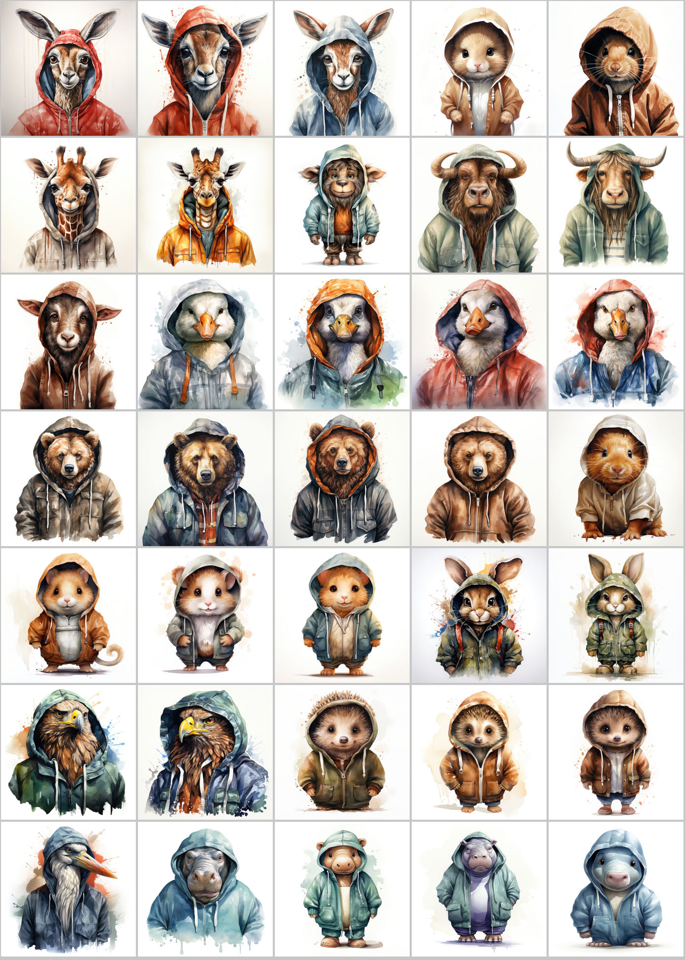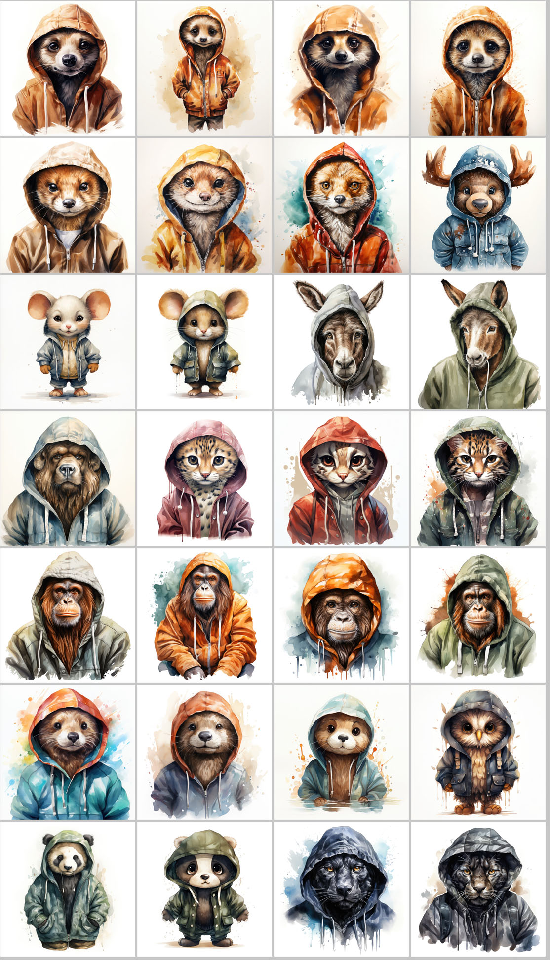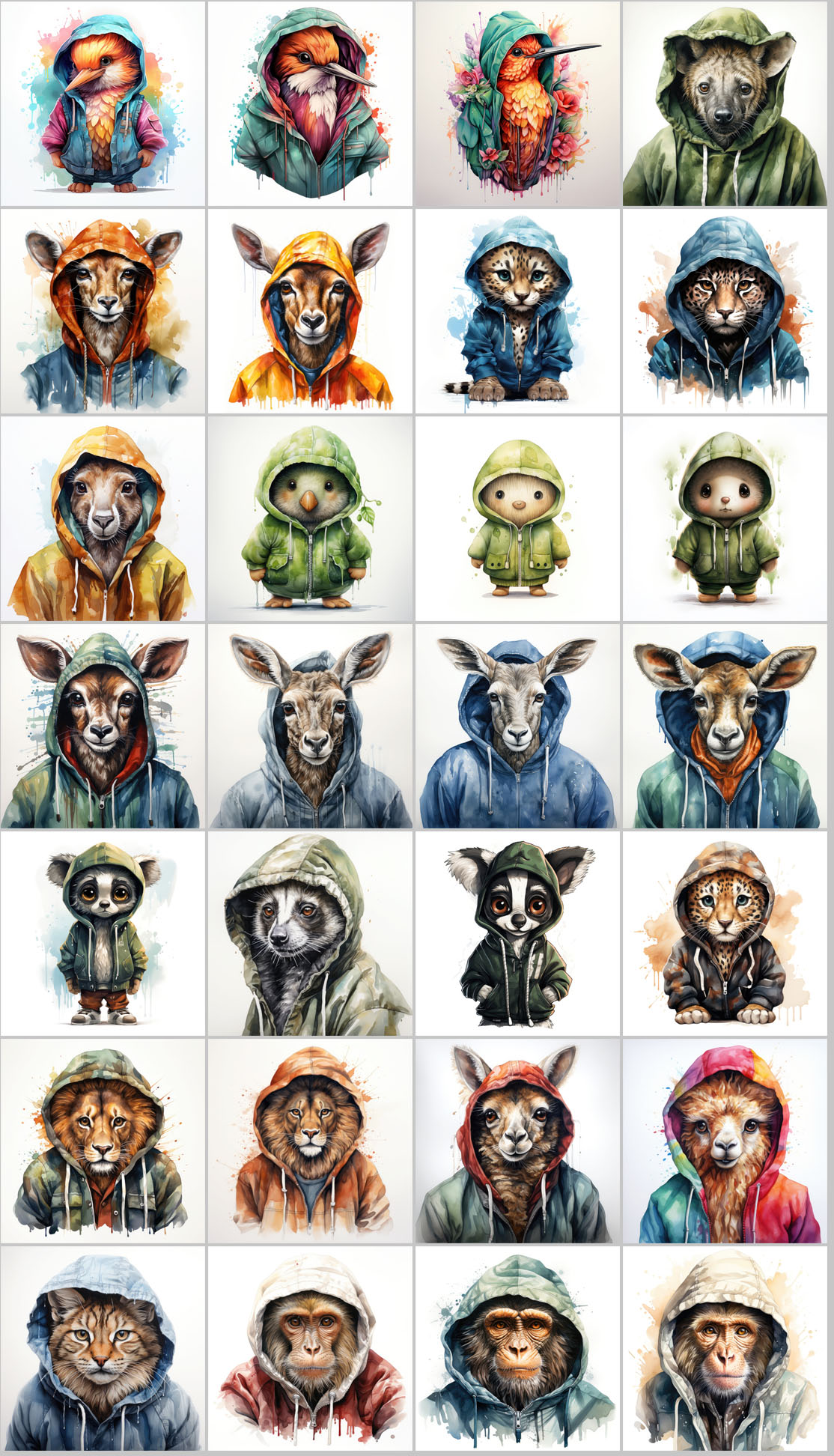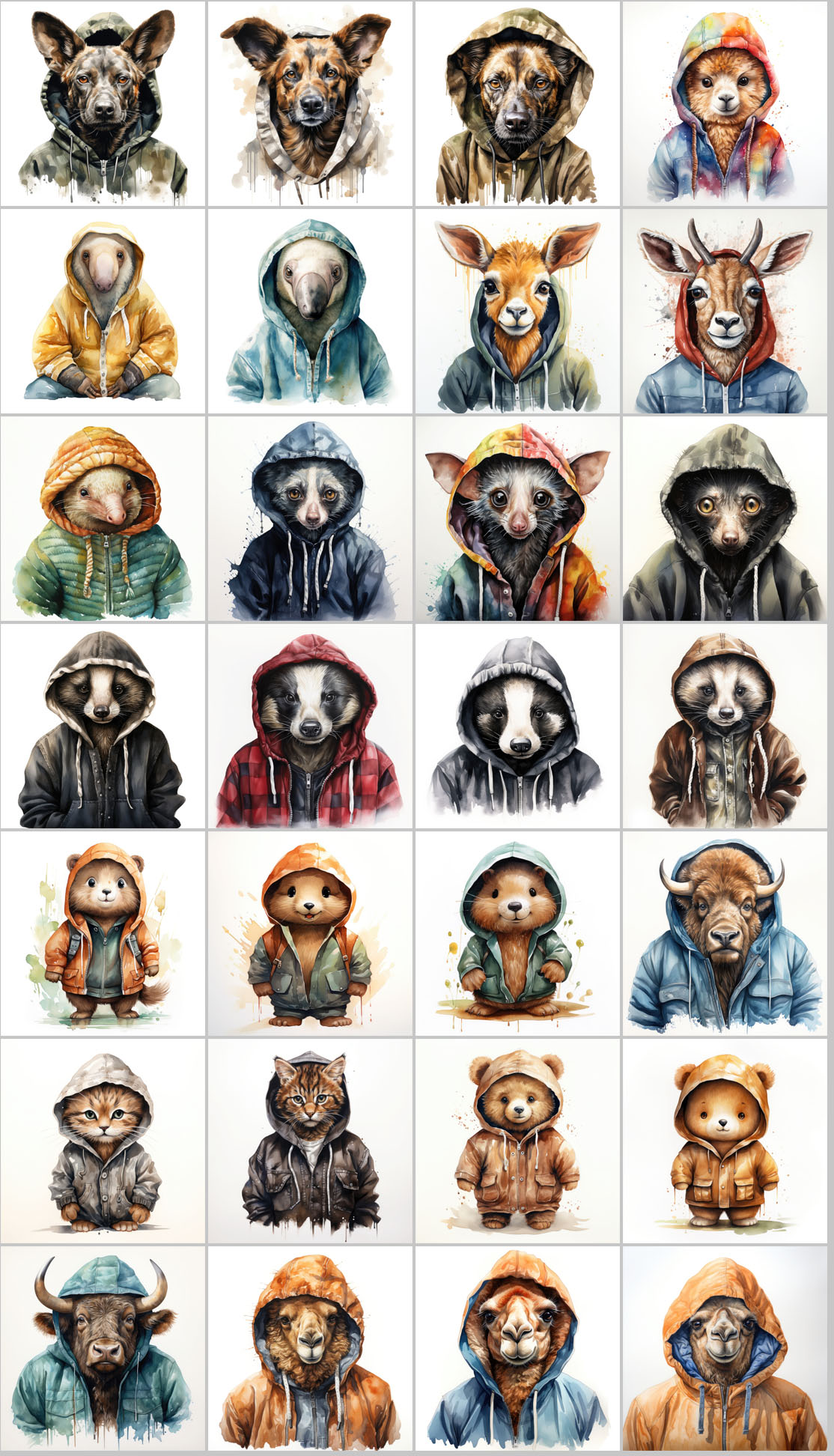Bring your creativity to life with 590 watercolor animals wearing fashionable hoodies! These fun-loving illustrations are the perfect way to add a splash of energy and personality to any project. Unleash your inner artist! Unleash your creativity with our Vibrant Watercolor Animal Hoodie Collection! This impressive set of 590 unique, high-resolution (6144 x 6144 pixels) animal images in playful, vivid colours is just the versatile digital resource you’ve been looking for.