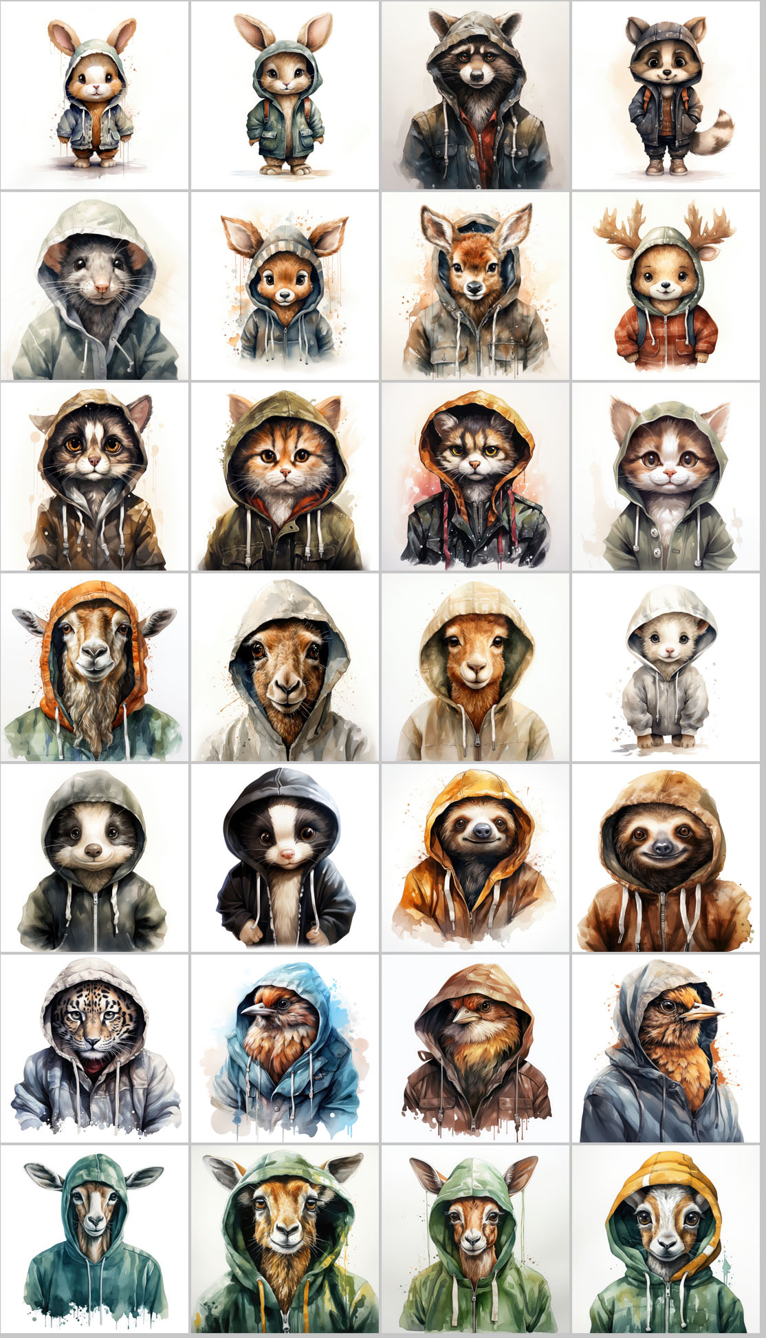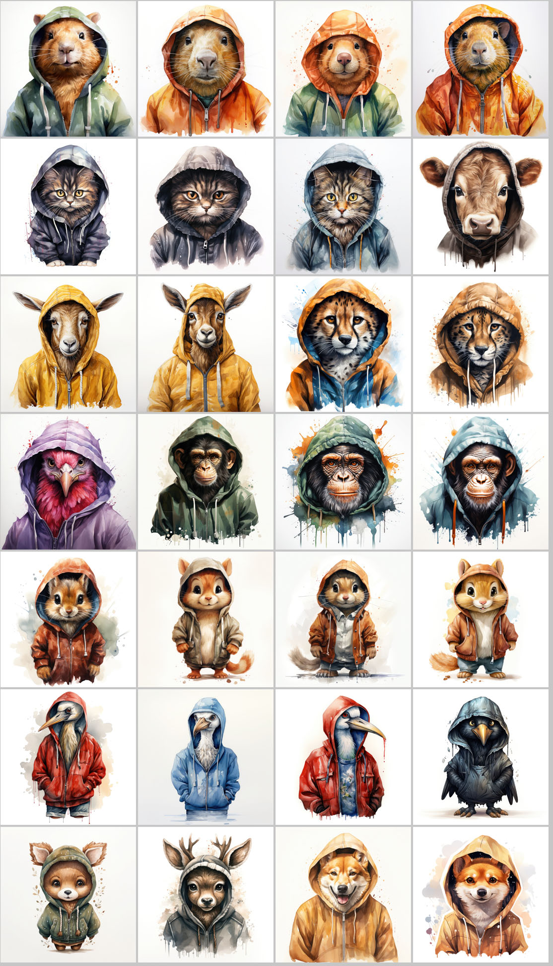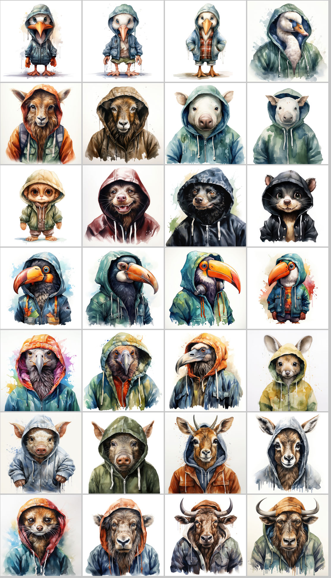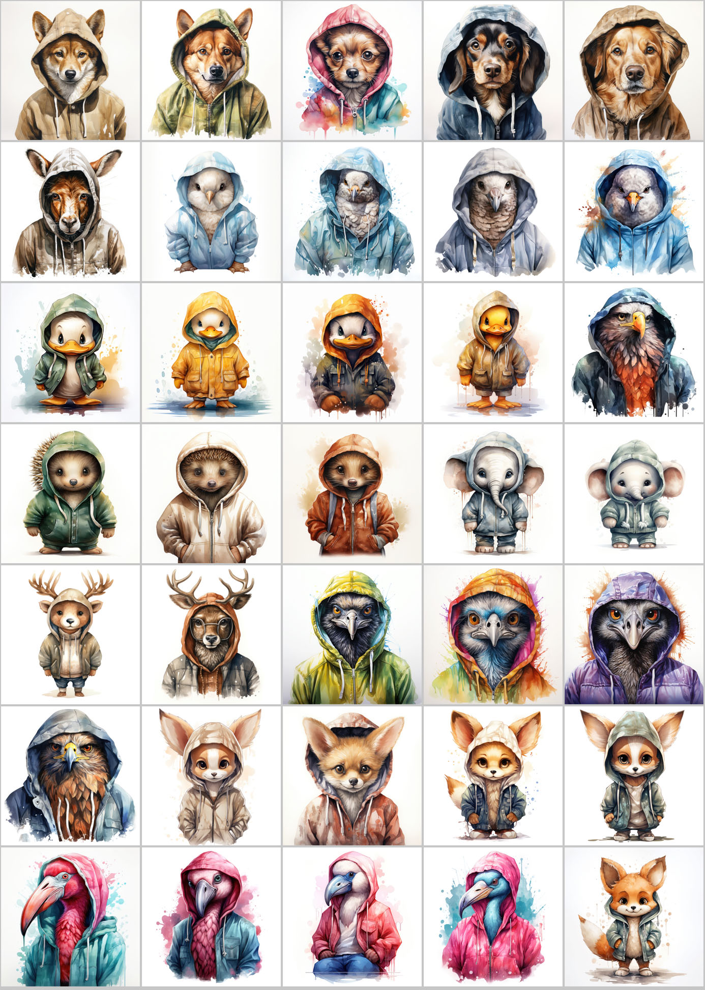 Bring your creativity to life with 590 watercolor animals wearing fashionable hoodies! These fun-loving illustrations are the perfect way to add a splash of energy and personality to any project. Unleash your inner artist! Unleash your creativity with our Vibrant Watercolor Animal Hoodie Collection! This impressive set of 590 unique, high-resolution (6144 x 6144 pixels) animal images in playful, vivid colours is just the versatile digital resource you’ve been looking for.