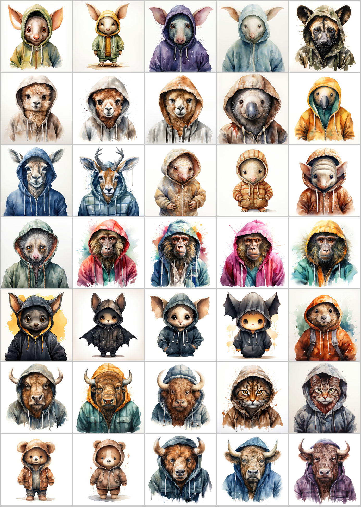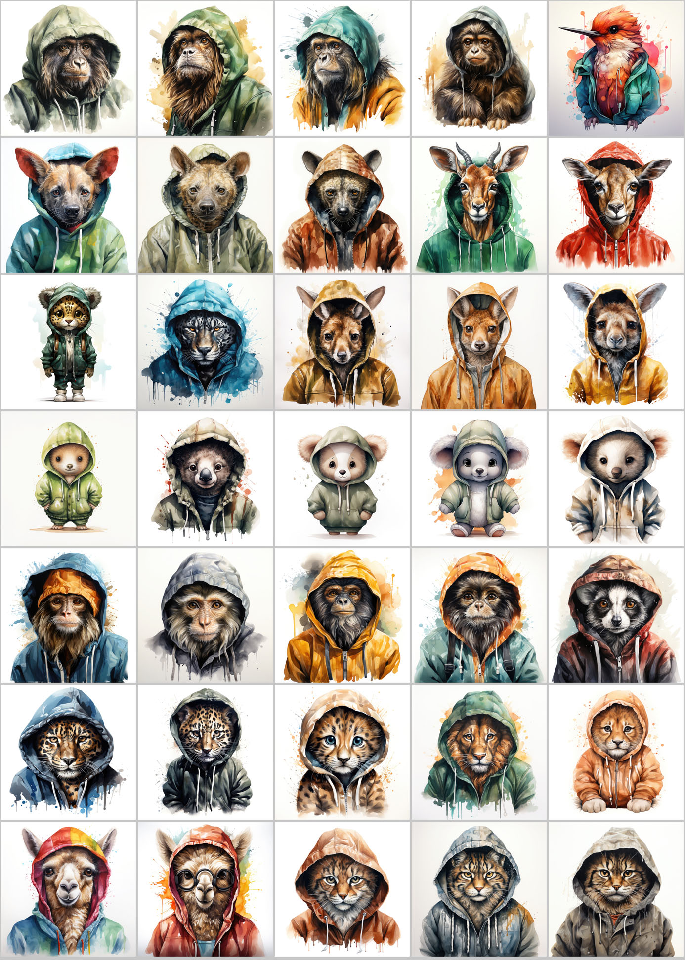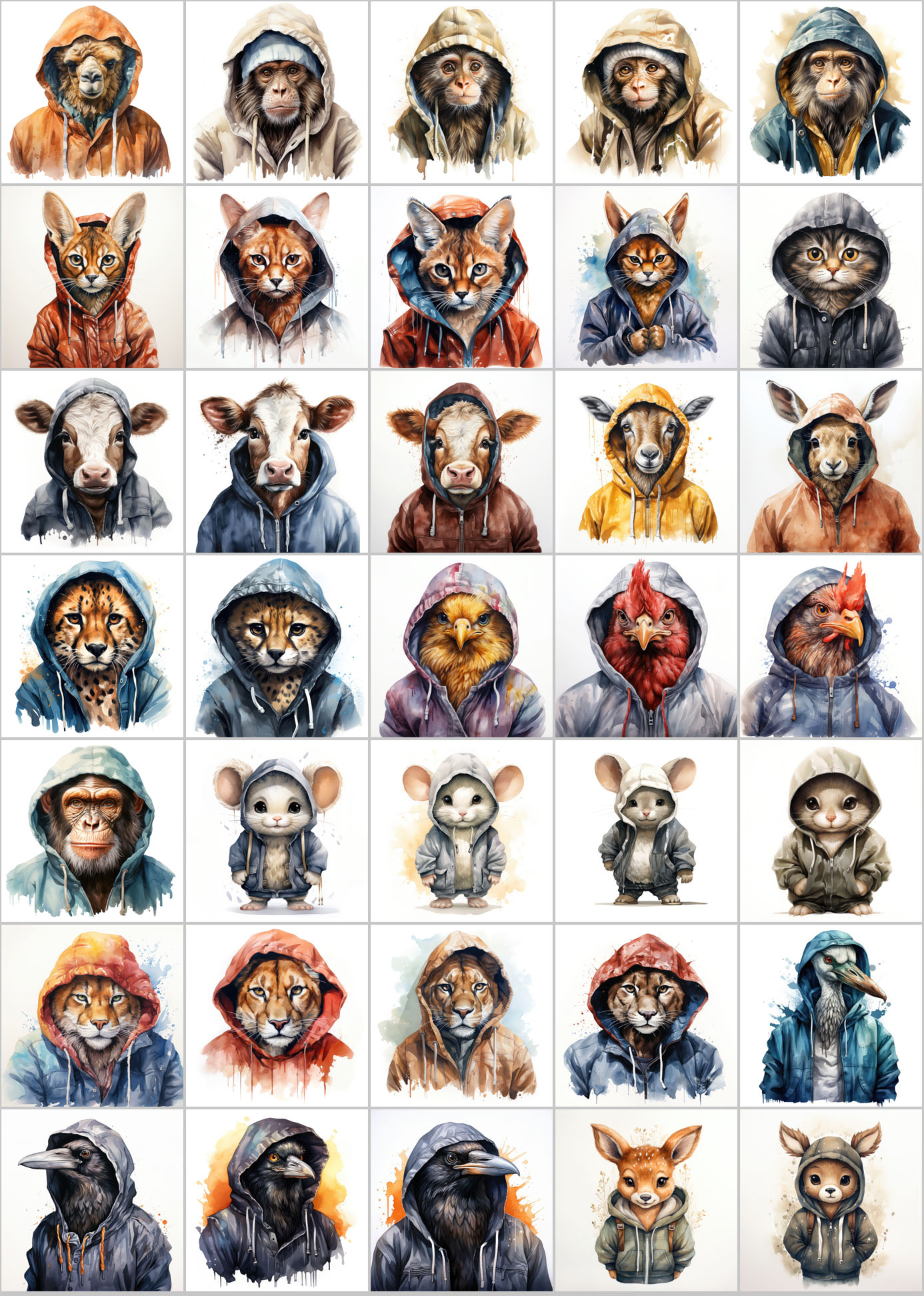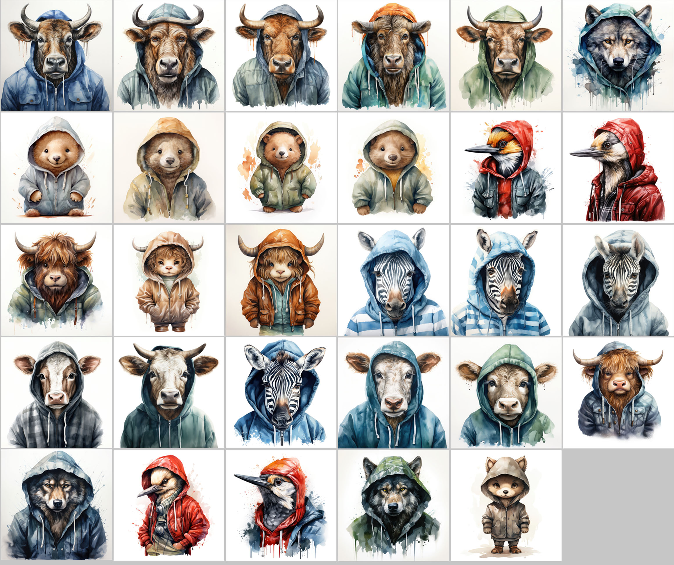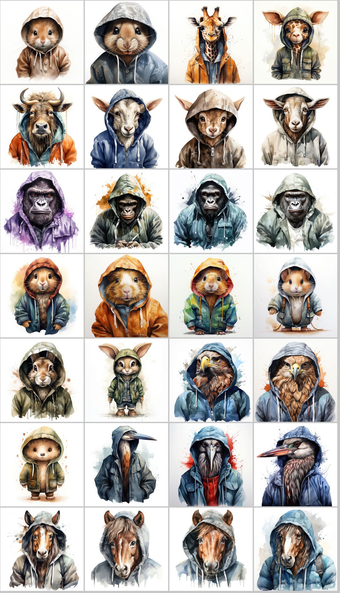 Bring your creativity to life with 590 watercolor animals wearing fashionable hoodies! These fun-loving illustrations are the perfect way to add a splash of energy and personality to any project. Unleash your inner artist! Unleash your creativity with our Vibrant Watercolor Animal Hoodie Collection! This impressive set of 590 unique, high-resolution (6144 x 6144 pixels) animal images in playful, vivid colours is just the versatile digital resource you’ve been looking for.