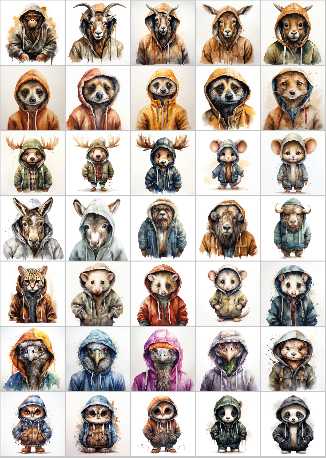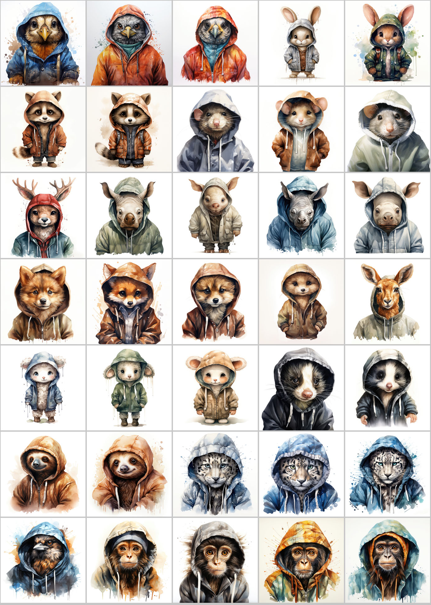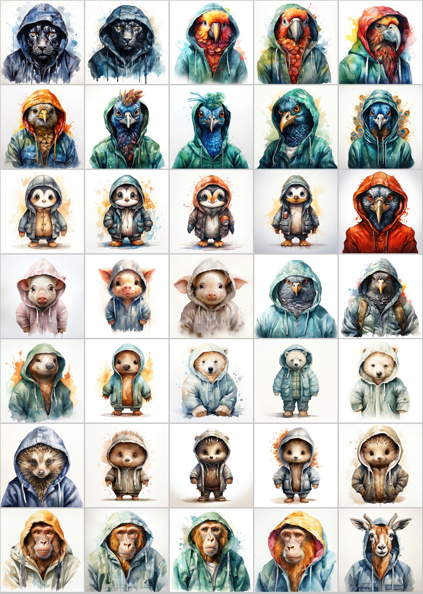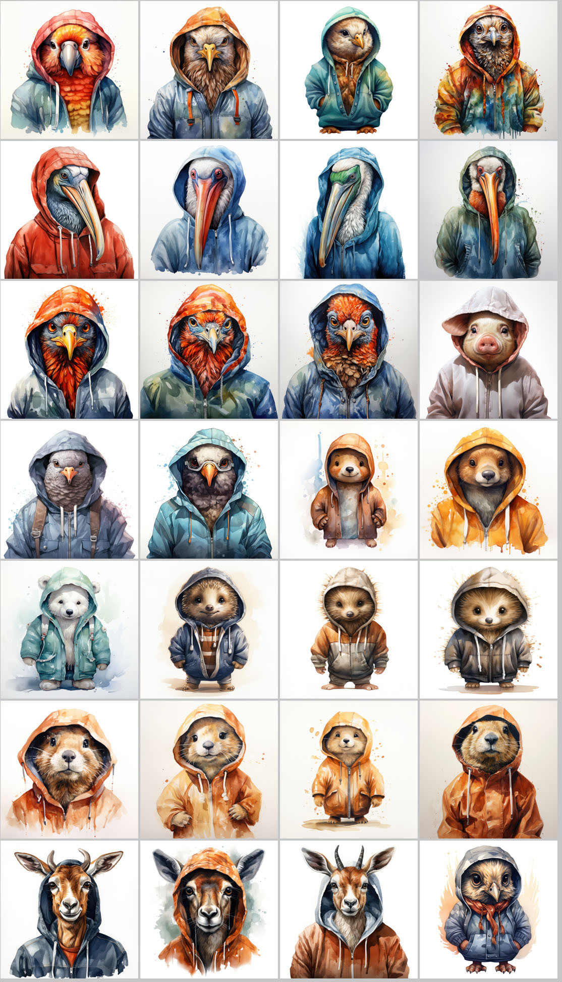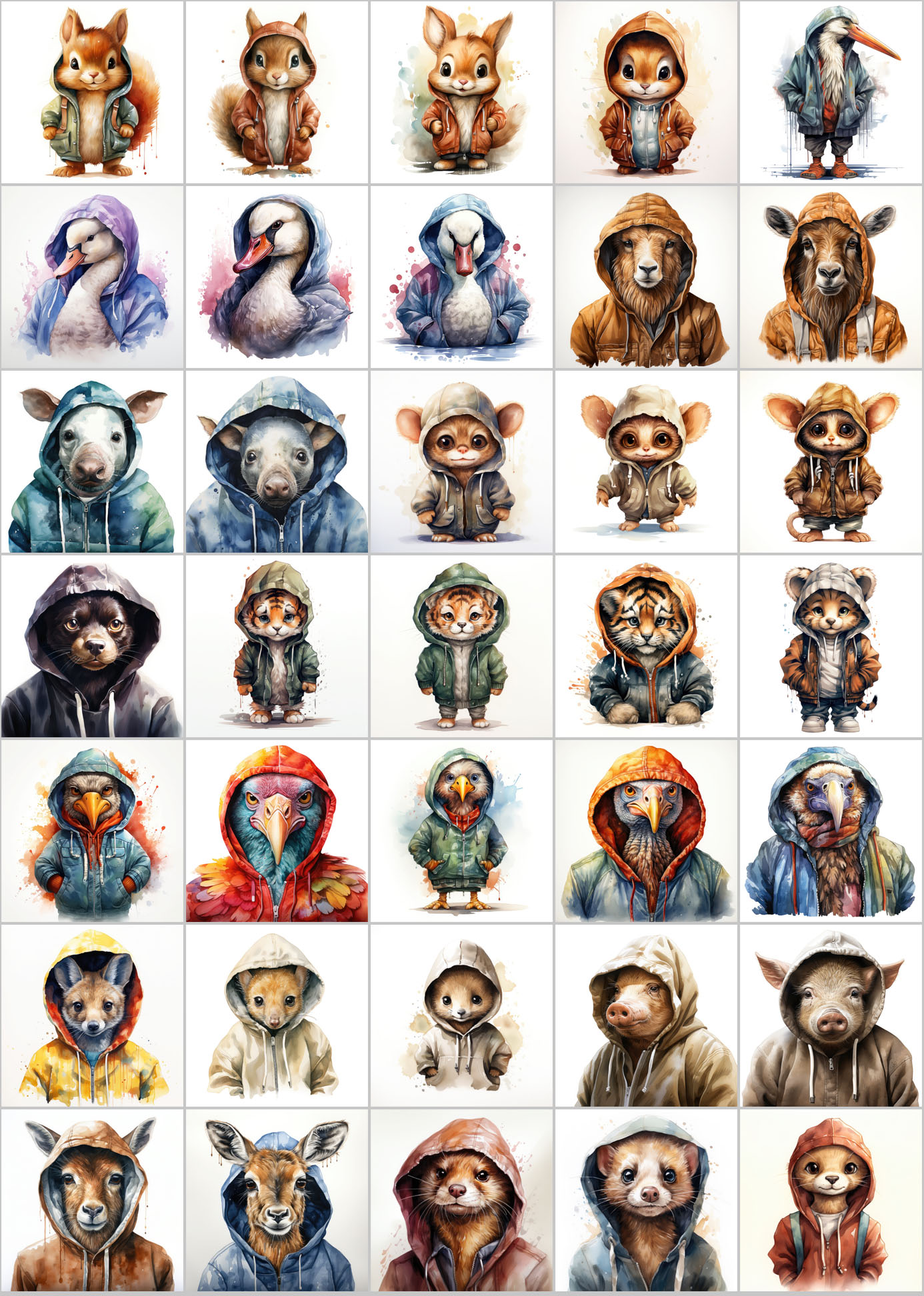 Bring your creativity to life with 590 watercolor animals wearing fashionable hoodies! These fun-loving illustrations are the perfect way to add a splash of energy and personality to any project. Unleash your inner artist! Unleash your creativity with our Vibrant Watercolor Animal Hoodie Collection! This impressive set of 590 unique, high-resolution (6144 x 6144 pixels) animal images in playful, vivid colours is just the versatile digital resource you’ve been looking for.