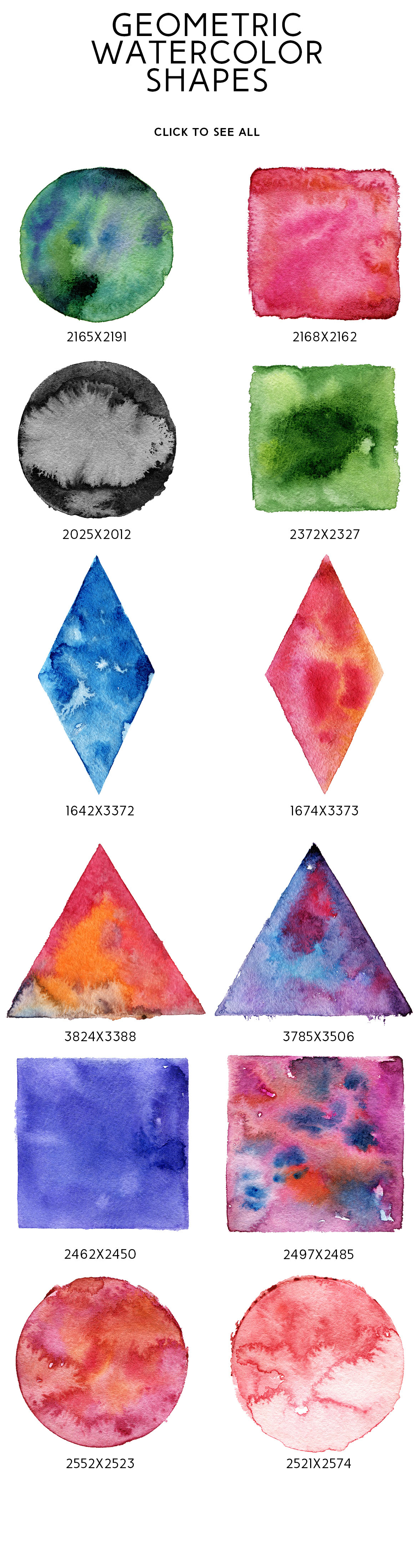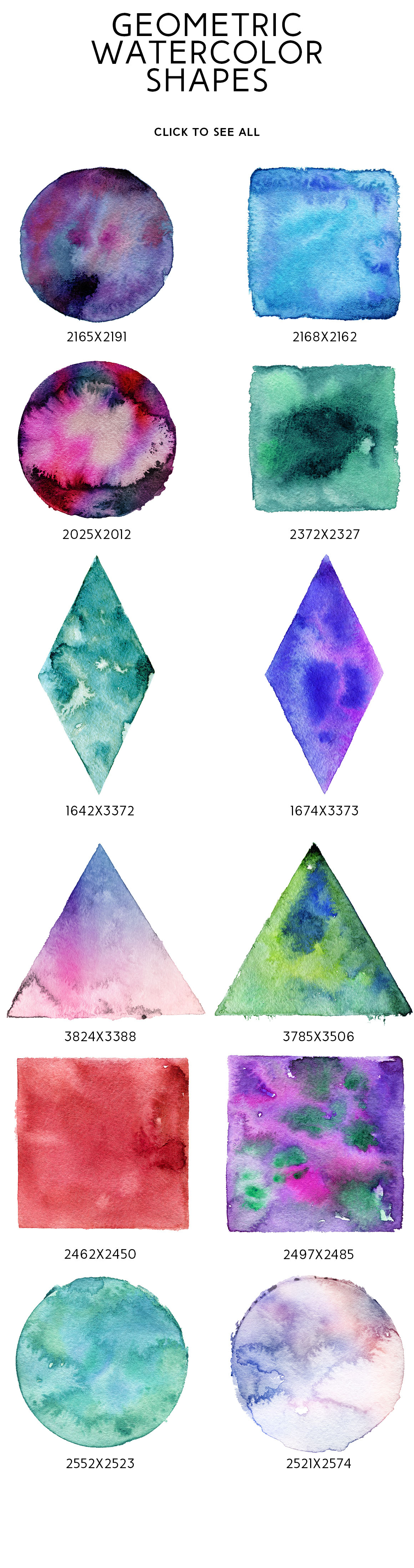 - 24 Geometric Watercolor Shapes – various pixels, 300 DPI