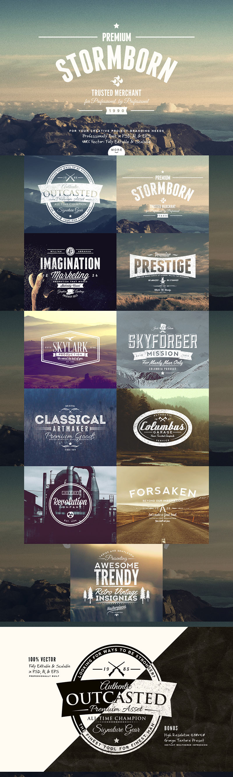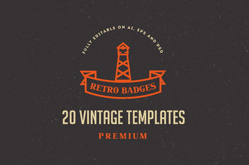 20 Logos, badges and insignias ready to use, fully editable. Add this awesome retro vintage style to your designs! 🙂 PSD + AI + EPS included