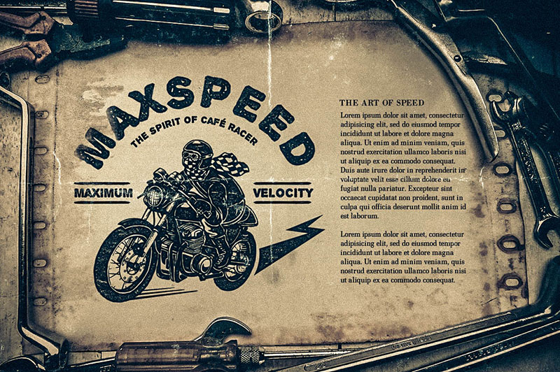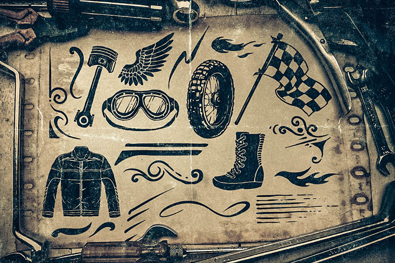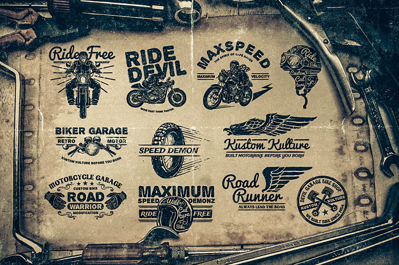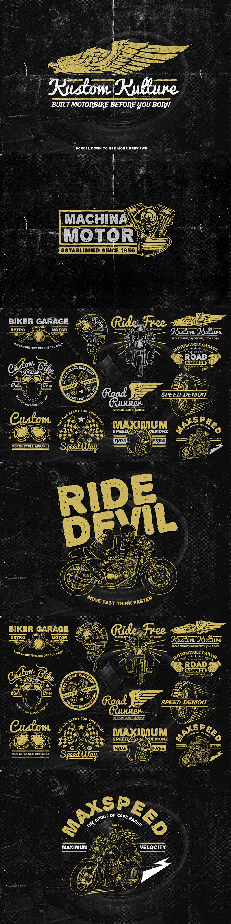 Welcome to my garage! Inside of this garage are 15 logos / badges of cafe racer, brat style, retro helmet, machine and anything related with retro motorcycle and custom culture, everyone love custom bike! So what inside of this garage? 15 handdrawn retro motorcycle badges / logos in one color (great to use on light background). 15 handdrawn retro motorcycle badges / logos inverted in two colors (great to use on dark background). 15 handdrawn retro motorcycle badges / logos Inverted in one color (great to use on dark background). Fully editable ( text, colors, etc ). Organized layers and easy to move / remove the object. Only free fonts used ( Download link available inside the zip file ). 100% vector. BONUS: 20 handdrawn ornaments and separate vector elements. FILES: Logos / Badges : AI + EPS + PSD, Bonus : AI + EPS!