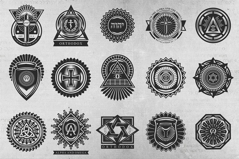 Collection of vector objects, badges, insignia and icons / symbols inspired from “tetragrammaton” and ancient orthodox church ornaments / iconography. 15 Logo / badges template, 20 sunbursts , Each objects are separated in layers, Easy to remove or add each element , 100% Vector. AI + EPS + PDF!