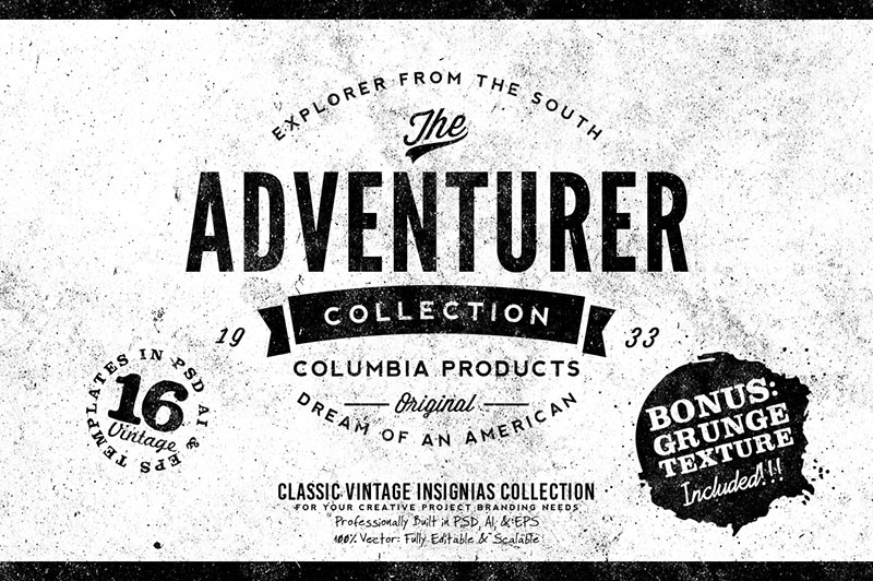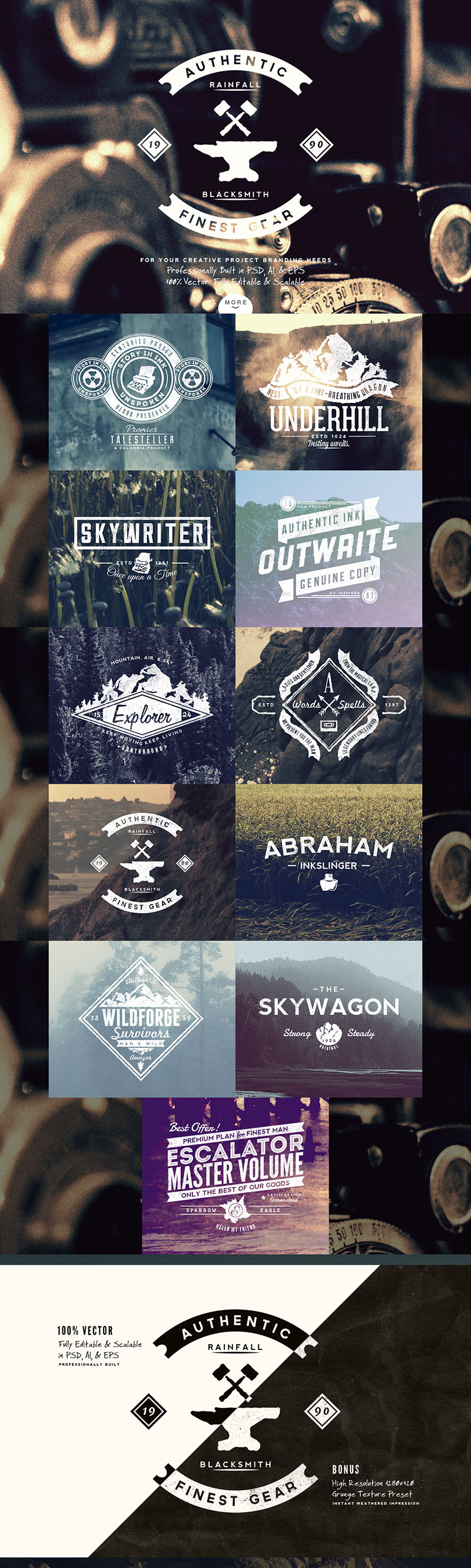 Here’s a set of 16 classic retro vintage logos/ insignias which can be used as your logos, labels, badges, watermark and other identity and branding materials. Brand your creative projects with these retro style logos and it’ll bring out a strong branding presence and vintage handcrafted impression. 16 Classic Vintage Insignias/ Logos templates in PSD, AI, & EPS Files. Both black and white copies together with the texture as seen in preview.