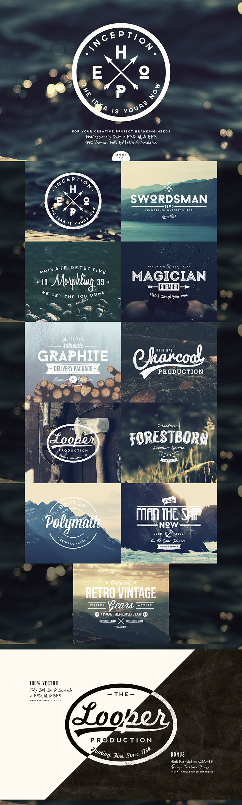 15 Logos, badges and insignias ready to use, fully editable. Add this awesome retro vintage style to your designs! 🙂 PSD + AI + EPS included