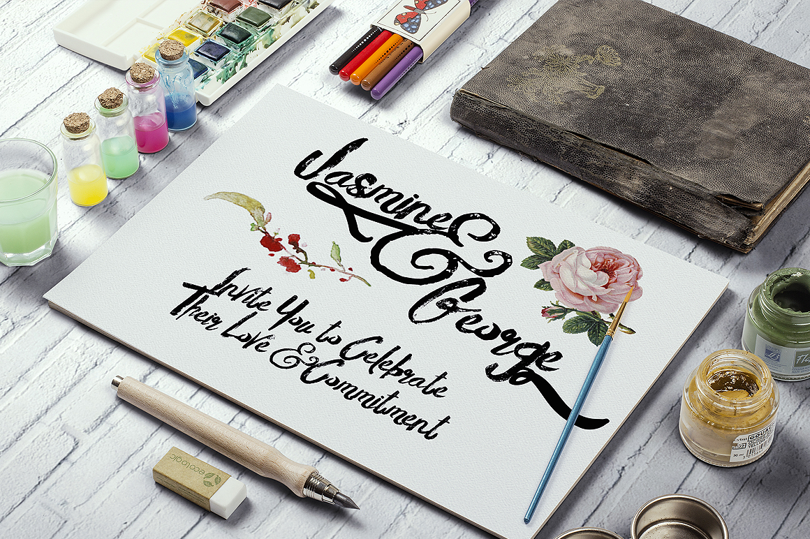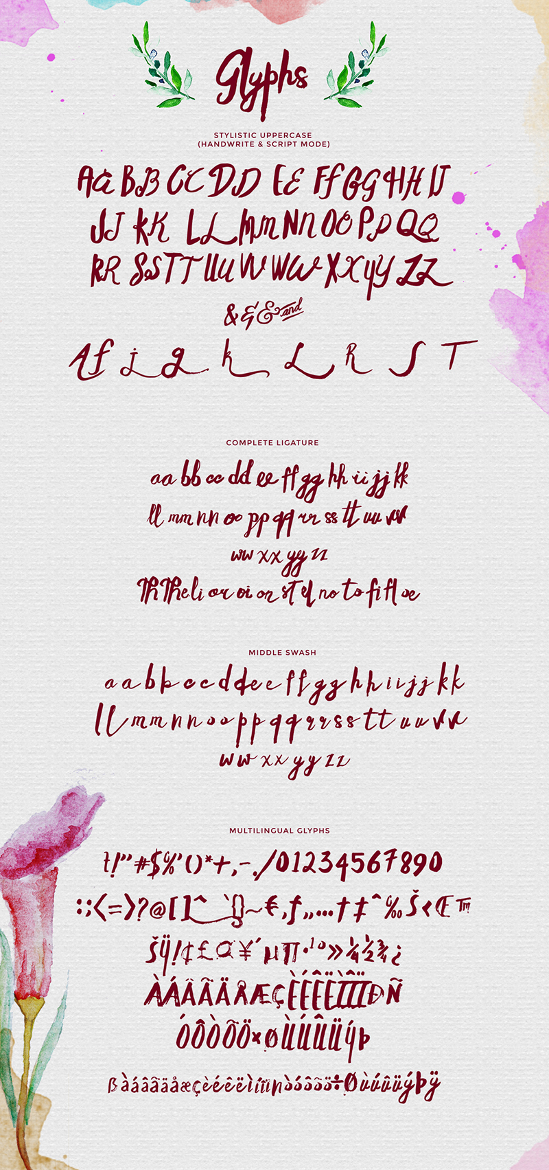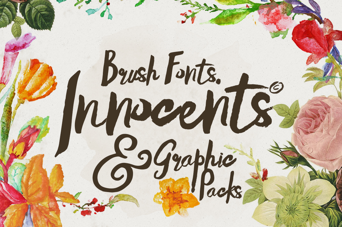 Innocents typeface was inspired when i drawing with my kids, with based from tradisional brush and watercolor can make the natural typographic. Over 250 glyphs can make you something different like save the date, modern show or traditional event, film title, birthday party, gig or anything you want to, just combine between botanical flower packs, and write the text choose stylistic glyphs like in this presentation. Features: Uppercase (2 different mode Script & sans serif handrawn), Lowercase ( 2 different mode normal & subtle swash between glyphs), Lumerals & Punctuation (Open type standard), Ligatures (see the preview for the ligature texts and try in the box text area), Stylishtic style, Accents (multilingual characters), Bonus botanical watercolor (transparant watercolor png files).