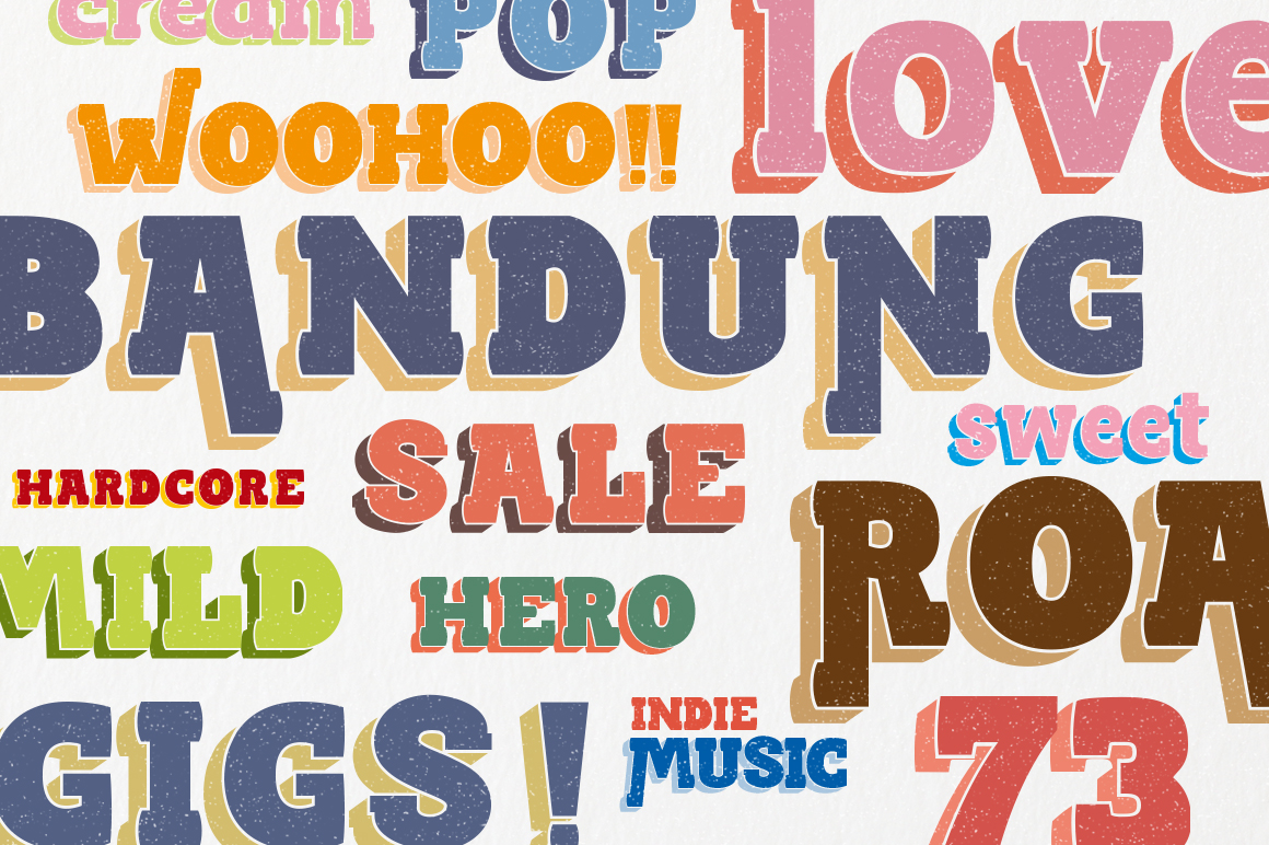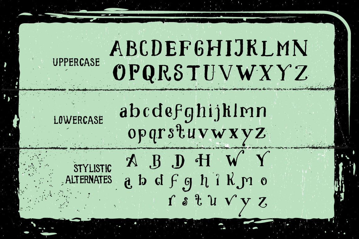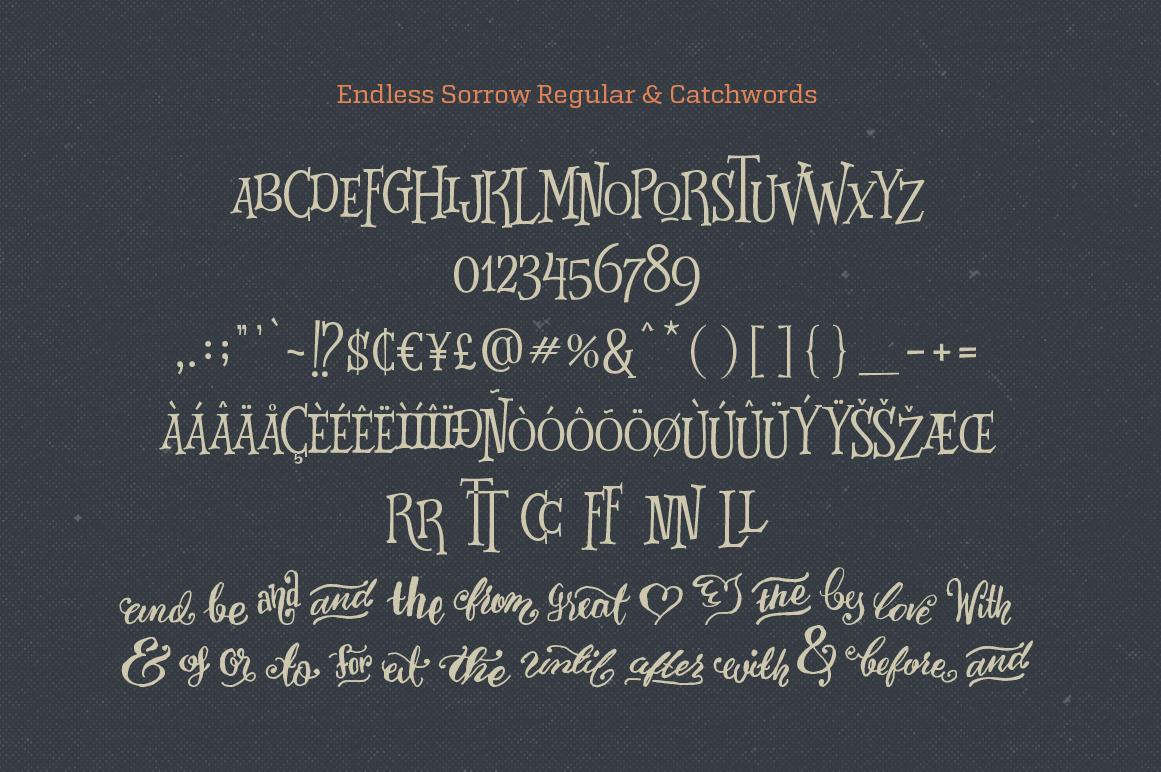 Endless Sorrow is a all caps versatile display font inspired by vintage typography that usually shown on poster, book and CD cover. The irregular height of the font clearly represents the feeling of hand-drawn and humanis. You can use it for your next handcrafted projects: poster, flyer, banner, illustration, cover, etc. Along with the regular Endless Sorrow font, you’ll also get a bunch of catch words as a bonus, which you can combine together with the regular font to get more variation for your design.