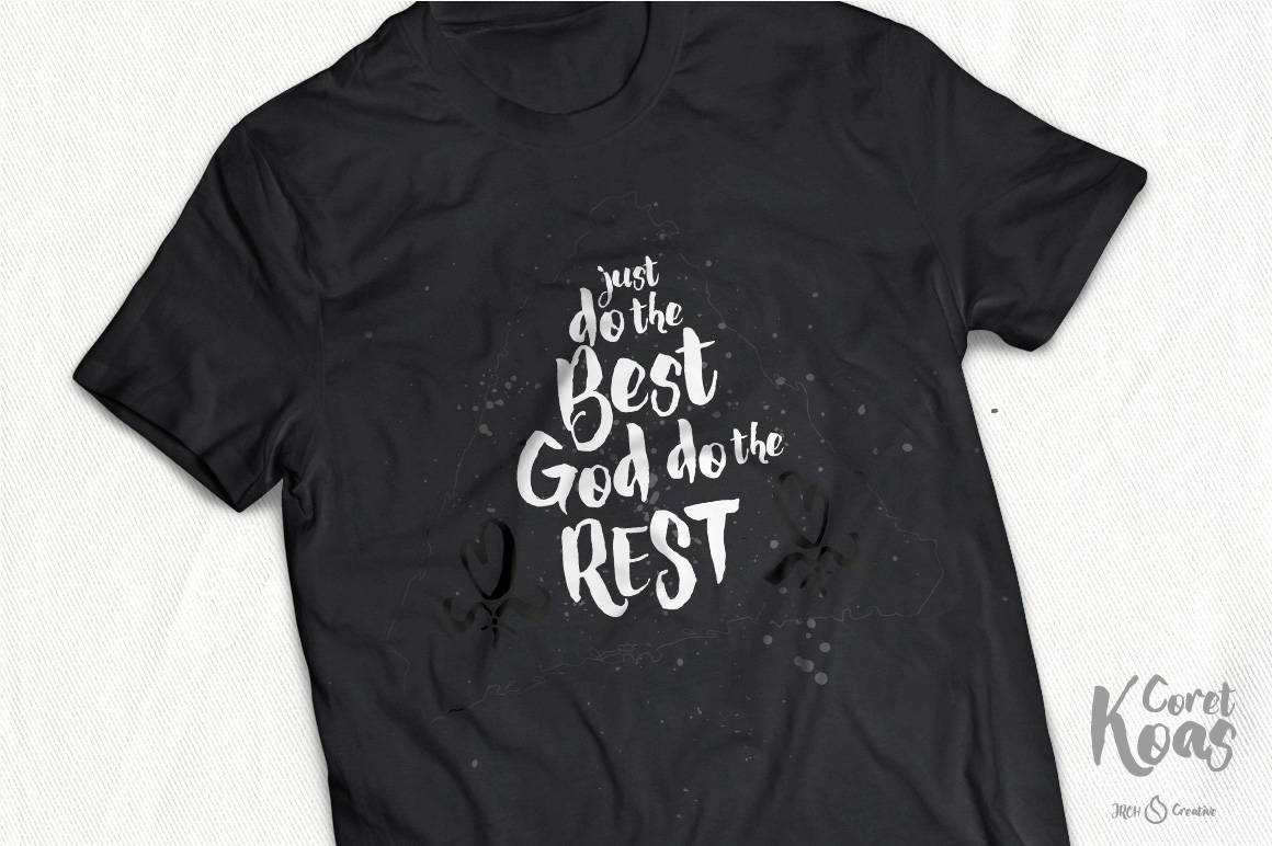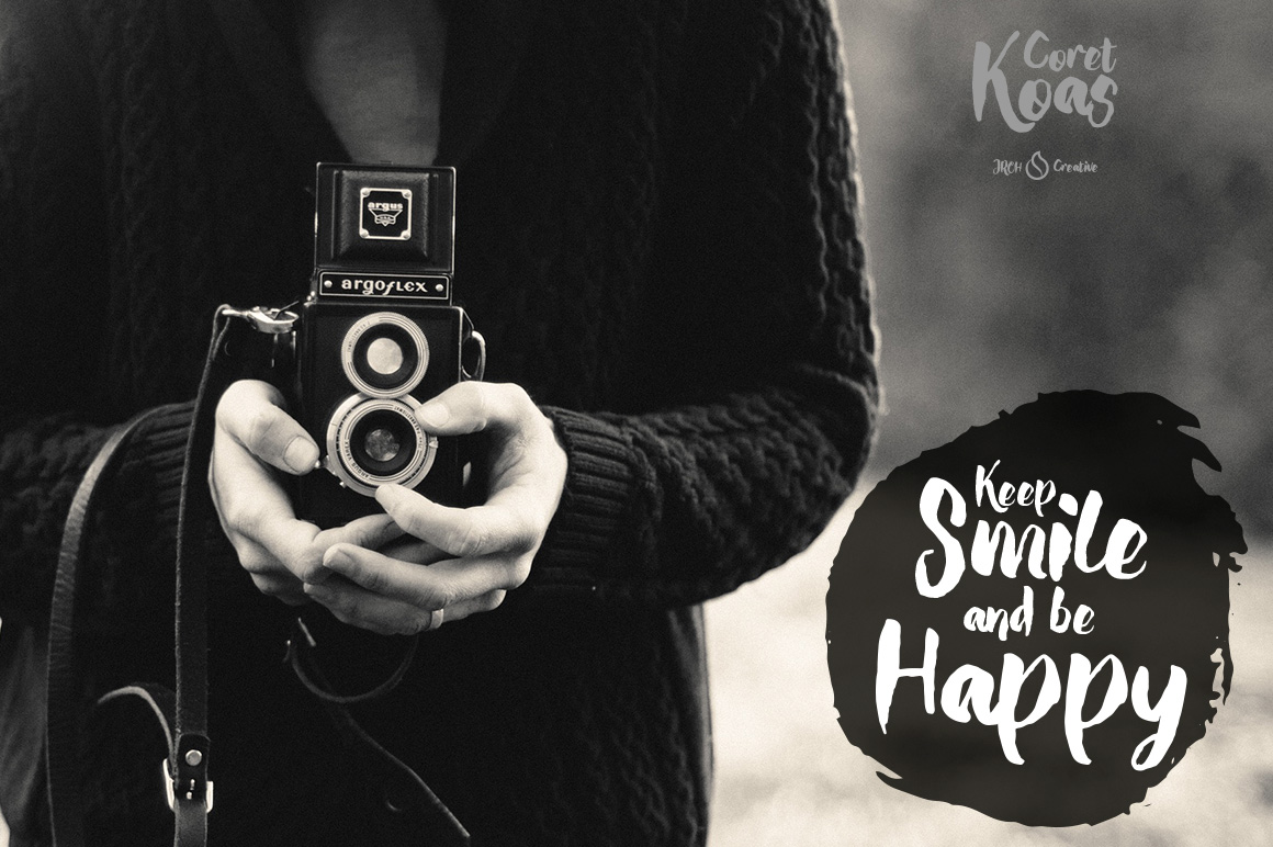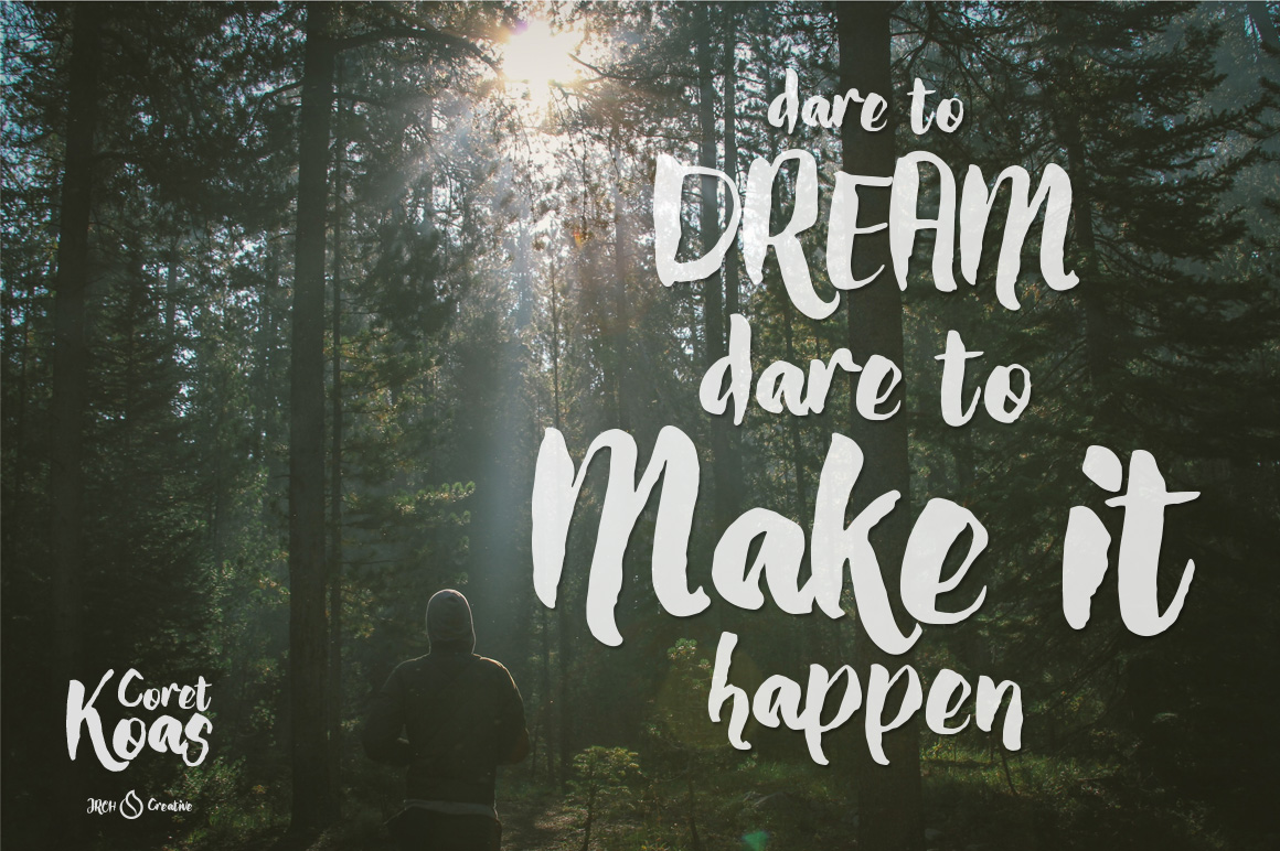 CoretKoas font is an expression of mood. Spontaneous brush and easy flow give the natural look. Great for designing book covers, film covers, apparel, cards, logos, poster, souvenirs, T-Shirt, etc.