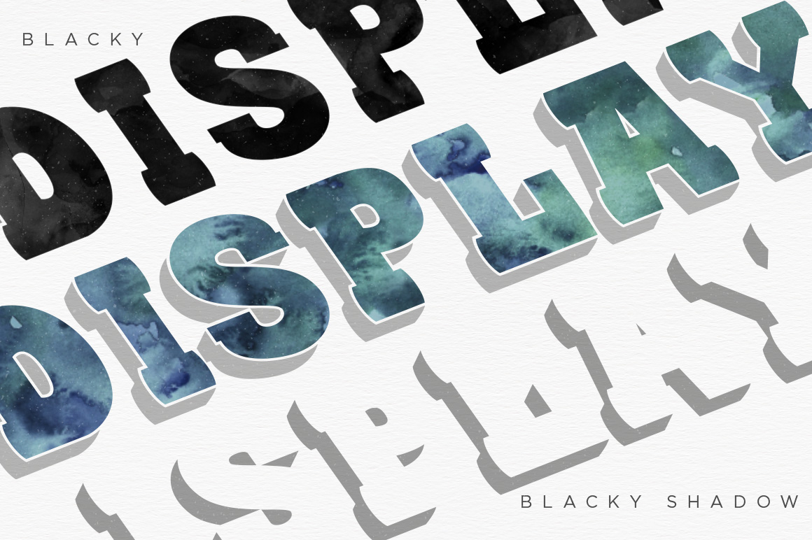 Blacky typeface is a modern slab serif font. OpenType features with Stylistic Alternates allows you to mix and match pairs of letters to fit your design. To access all the alternative glyphs, you need a program that supports OpenType features such as Adobe Illustrator CS and Adobe Indesign.