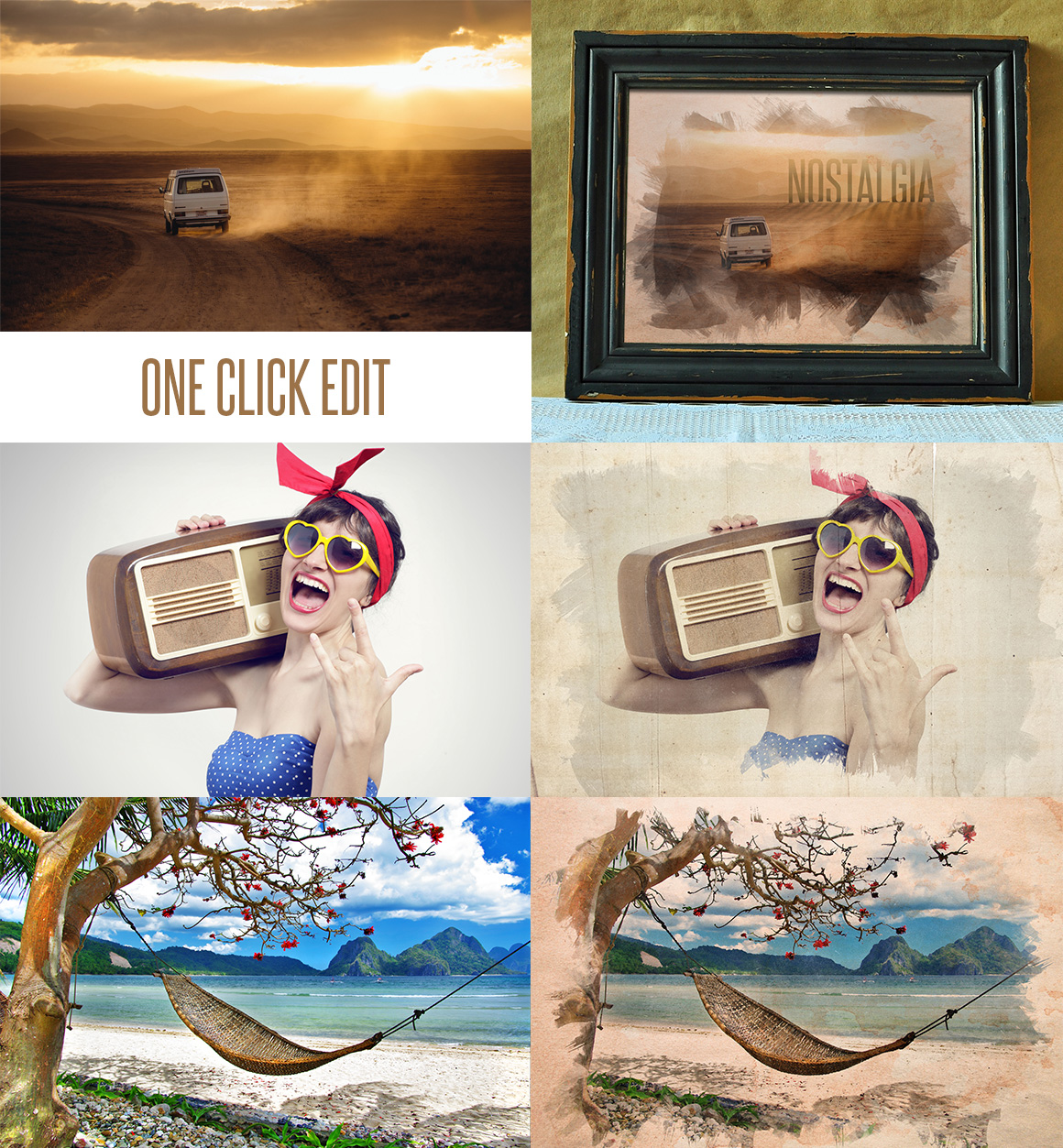 Give to your photos old watercolor framed look in seconds with one click. Just insert your photo and combine build in layers to create own unique effect.