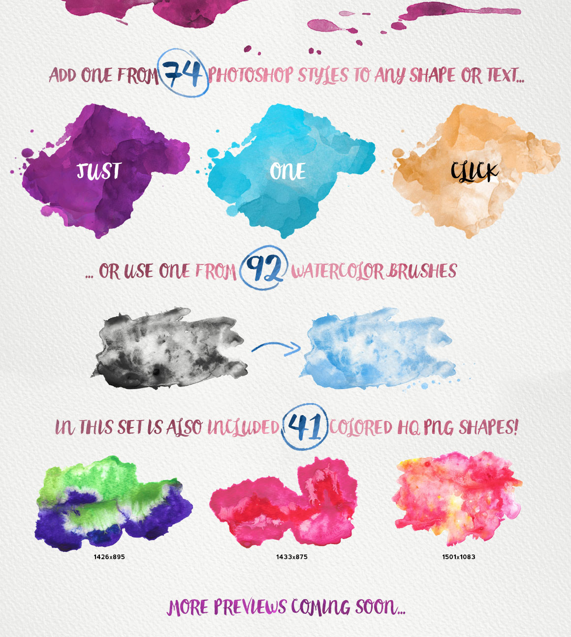 • 74 hand-made watercolor photoshop styles (.ASL files)