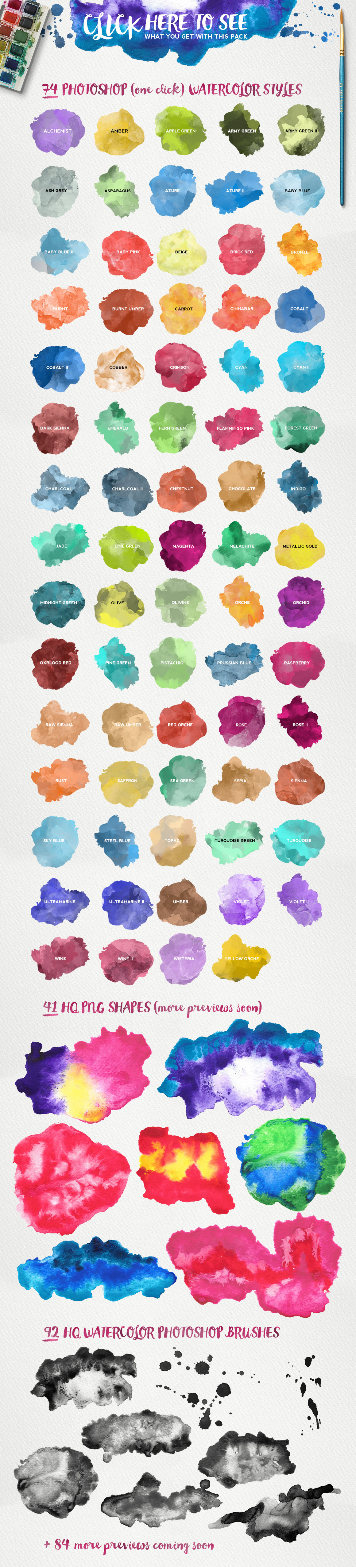 Watercolor Ultimate KIT is a set of hand-made watercolor PHOTOSHOP STYLES, HQ PHOTOSHOP BRUSHES and HQ PNG SHAPES to add unique watercolor effects easy. Requirements: Photoshop CS4+. WHAT YOU GET AFTER DOWNLOAD: