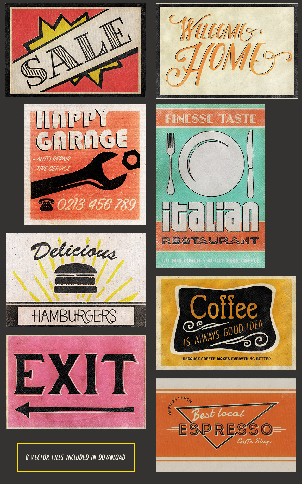 No outlining necessary, apply to live, editable text – simply select your text with the direct selection tool, then click on the graphic style thumbnail and you’re done! Works on objects too. Scales to any size without loss of resolution. Old Timer is made from Global Color Swatches for easy colour changes, or edit yourself using the appearance panel. What you get: • 1 Illustrator File – containing all 5 styles applied to live text. Just replace the fonts to whatever font you like (or install the one i used in the preview!) and you’re good to go. • 1 Graphic Style Library File Containing 5 Styles – Load this into your Graphic styles palette, select your object or text then simply click on a graphic style thumbnail. • Background texture is included. Requirements: Illustrator CS3 and upward. This file is not compatible with photoshop, or any other graphics program besides Adobe illustrator, you will not be able to open or edit the file unless you have illustrator CS3 or upward.