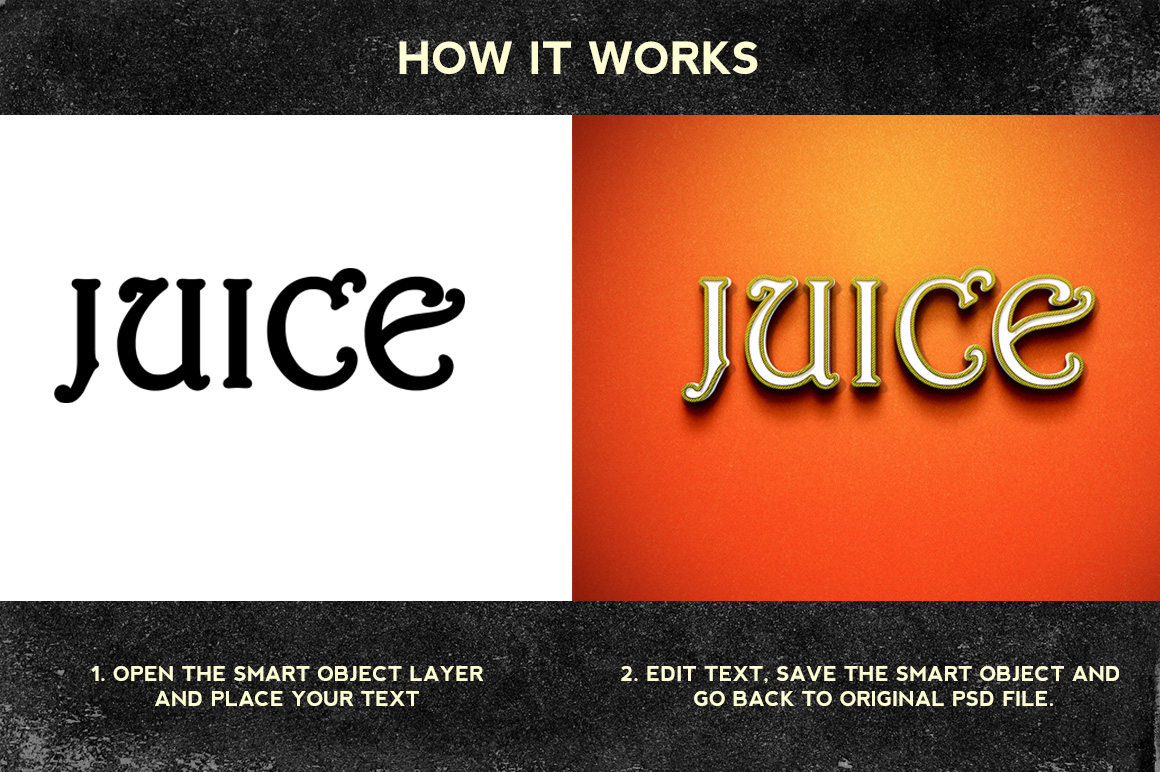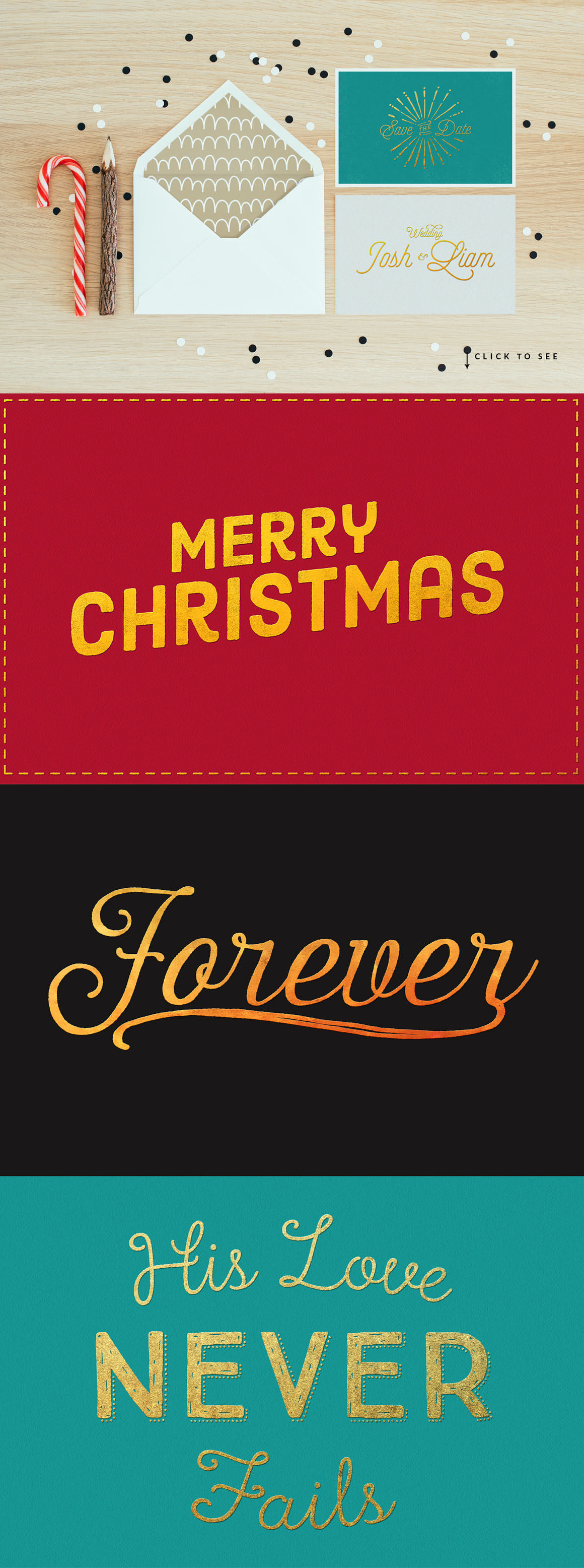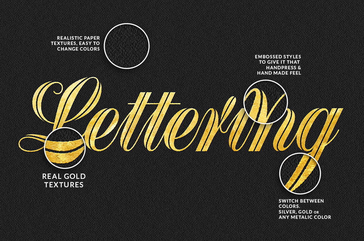 Add a touch of class to your type, hand lettering and calligraphy with realistic Gold Press Emboss effects in this easy to use Photoshop smart PSD.Emboss your text or any design you have. Specially for Wedding invitations, gift cards, etc… you name it! Add seamless backgrounds and make beautiful designs. Just drop in your work into the smart object and applied to it. But it’s not just gold. Also the ability to make your own foils with my unique actions. Just choose the colors and it makes the foil for you, ready to be place in the PSD. All this with my new easy to use Gold Press Lettering smart PSD. Add one or two layers of work and get realistic Gold, Silver or Metallic effects in just a few clicks. Requirements: Photoshop CS4 or above.