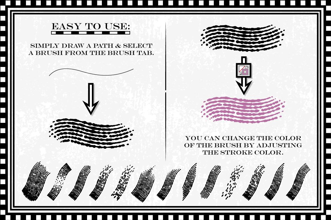 Give your vector illustrations a vintage print effect with this set of 32 brushes! Both the hand and the bowler hat from the preview were drawn using these brushes. To use the brushes simply draw a line with any of Illustrator’s drawing tools then apply the brush by clicking on an icon from the brushes tab. The color can be changed to suit your needs. Compatible with Illustrator CS1+ Easy to use – comes with instructions.