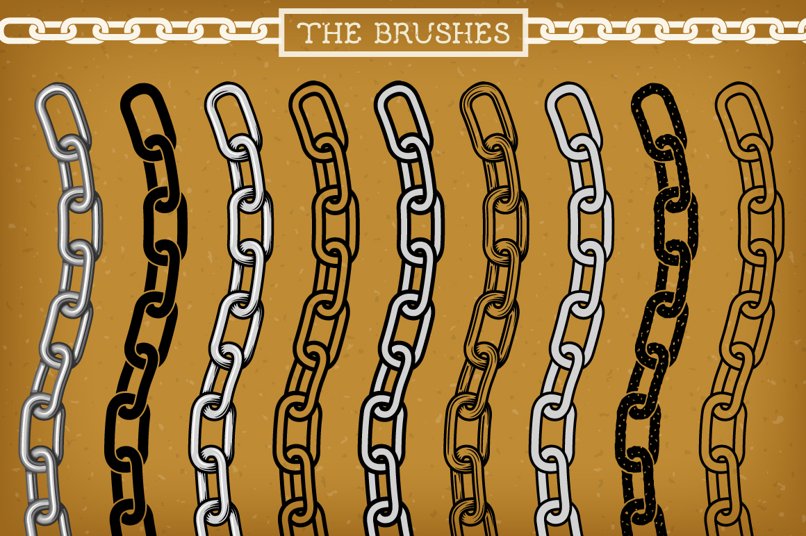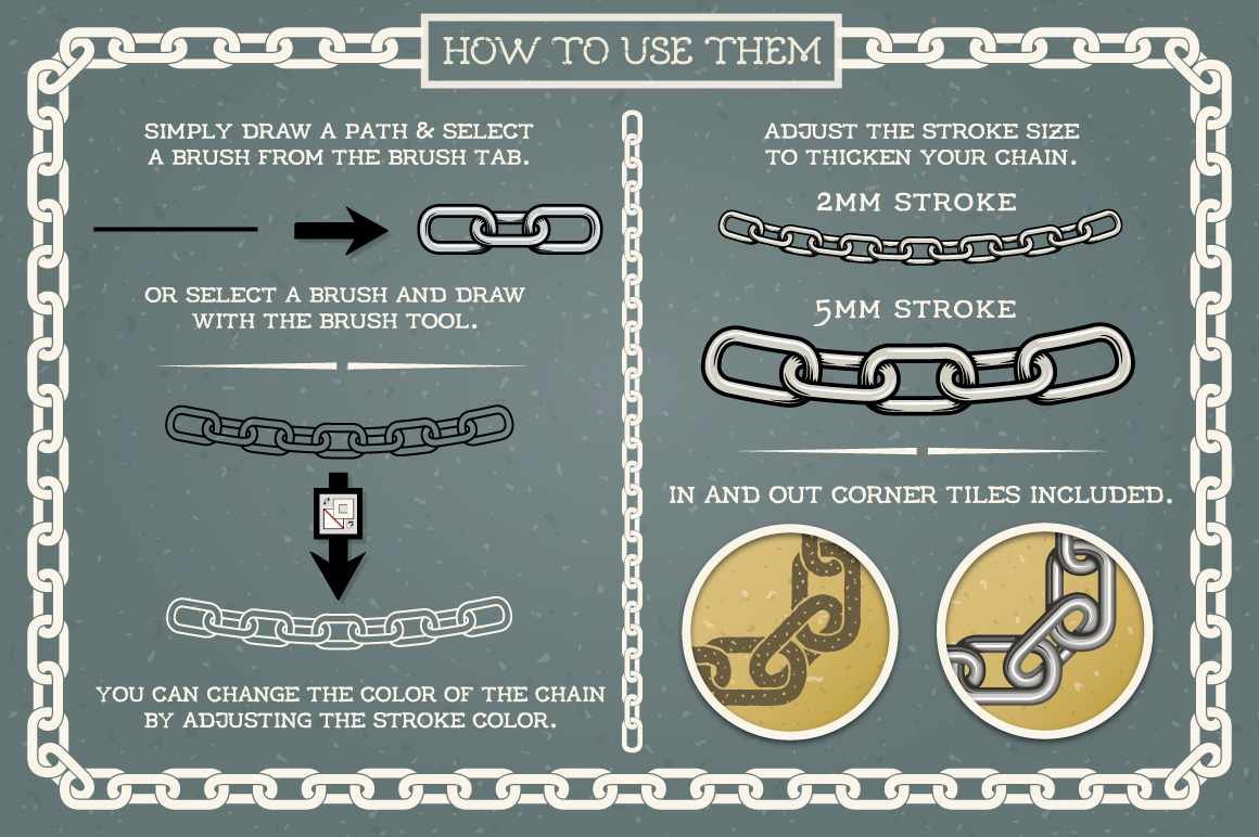 Draw chains with your mouse or tablet using these versatile brushes! They are perfect for borders, text, dividers, logos or to add a striking flourish to your designs. To use the brushes simply select a brush from the tab and draw with the brush tool. The color and width can be adjusted as required. Each brush has inner and outer corner tiles.