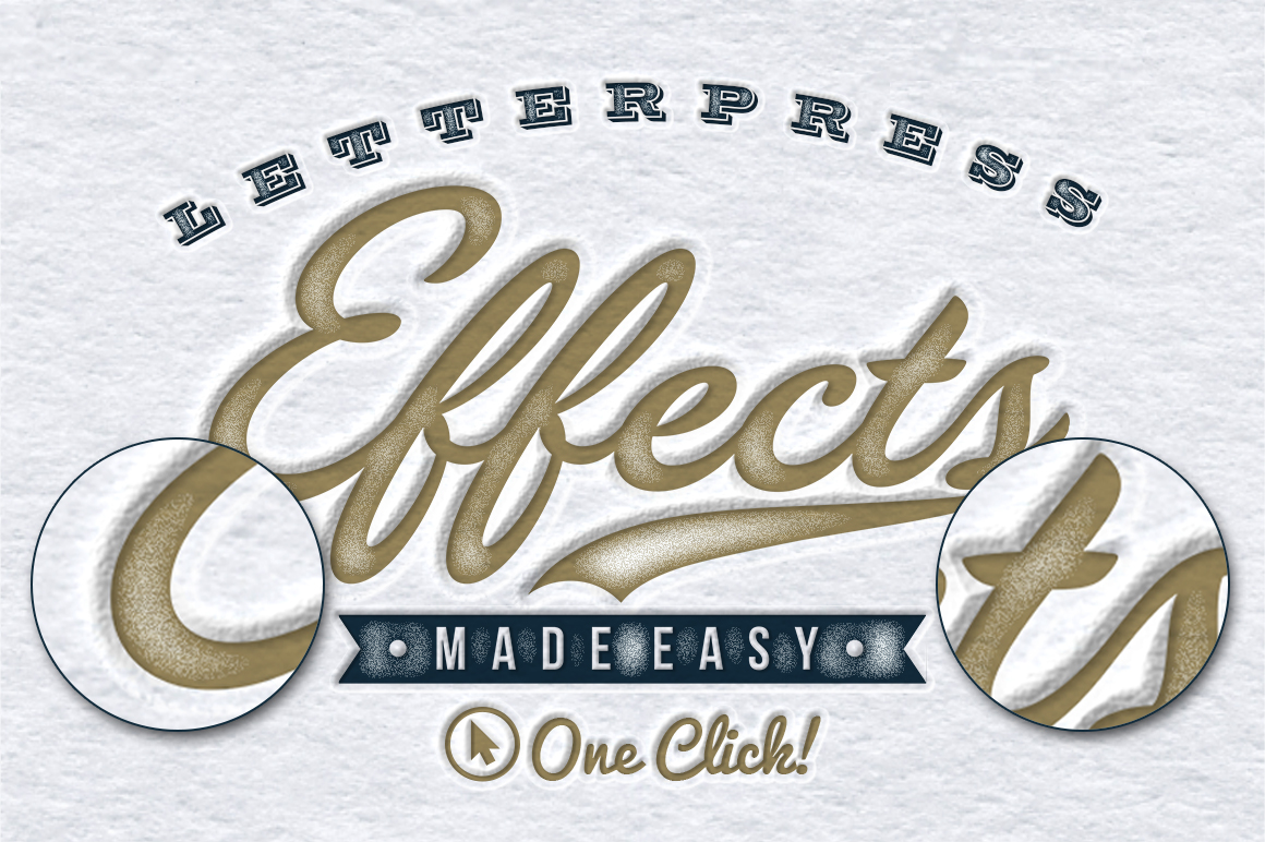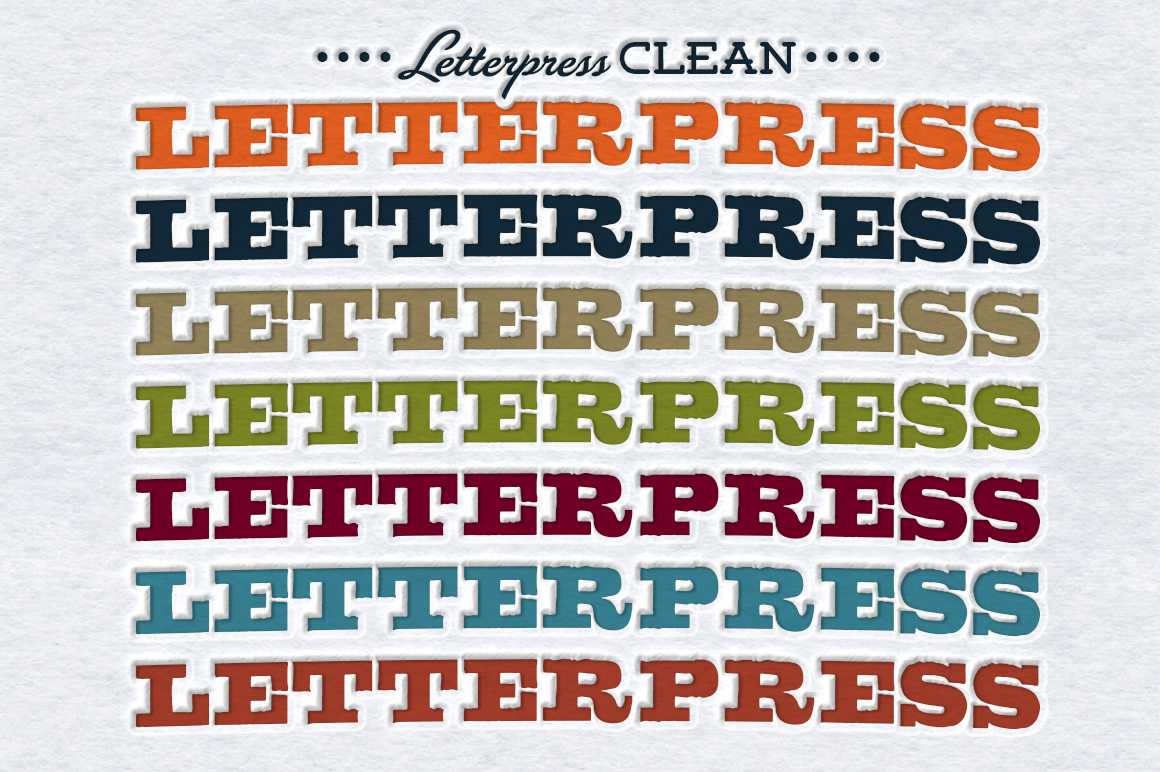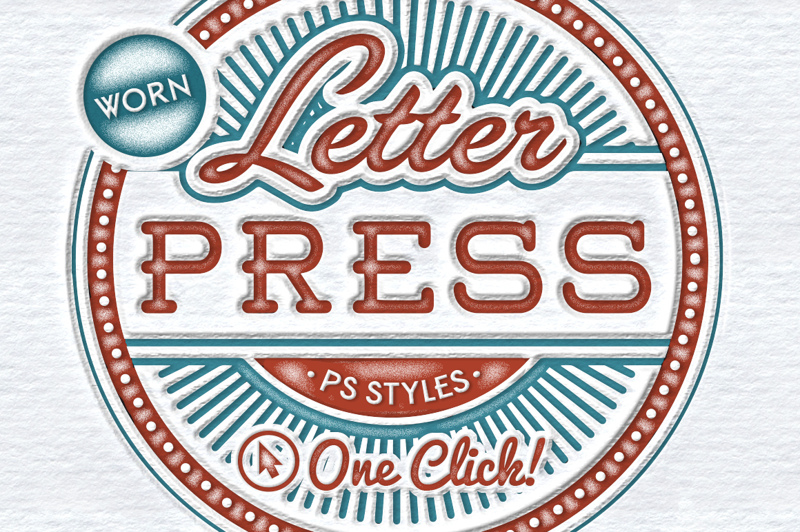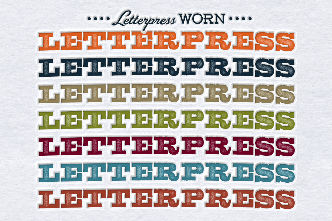 Mock up a vintage worn letterpress print finish in one click! • Includes 2 seamless paper layer styles • Worn and Clean Styles, plus different styles for bold or thin fonts. • Standard and ‘Deep’ pressed style • 7 colours included, plus ‘clear’ for pressed effect on paper only • Change colour and adjust the ‘worn’ effect to suit different font widths easily (see help file). WHAT YOU GET: • .asl style library of 49 styles which includes all letterpress and paper styles • Read Me file with instructions for scaling and editing and links to free fonts used in demo document • 1 Layered demo file