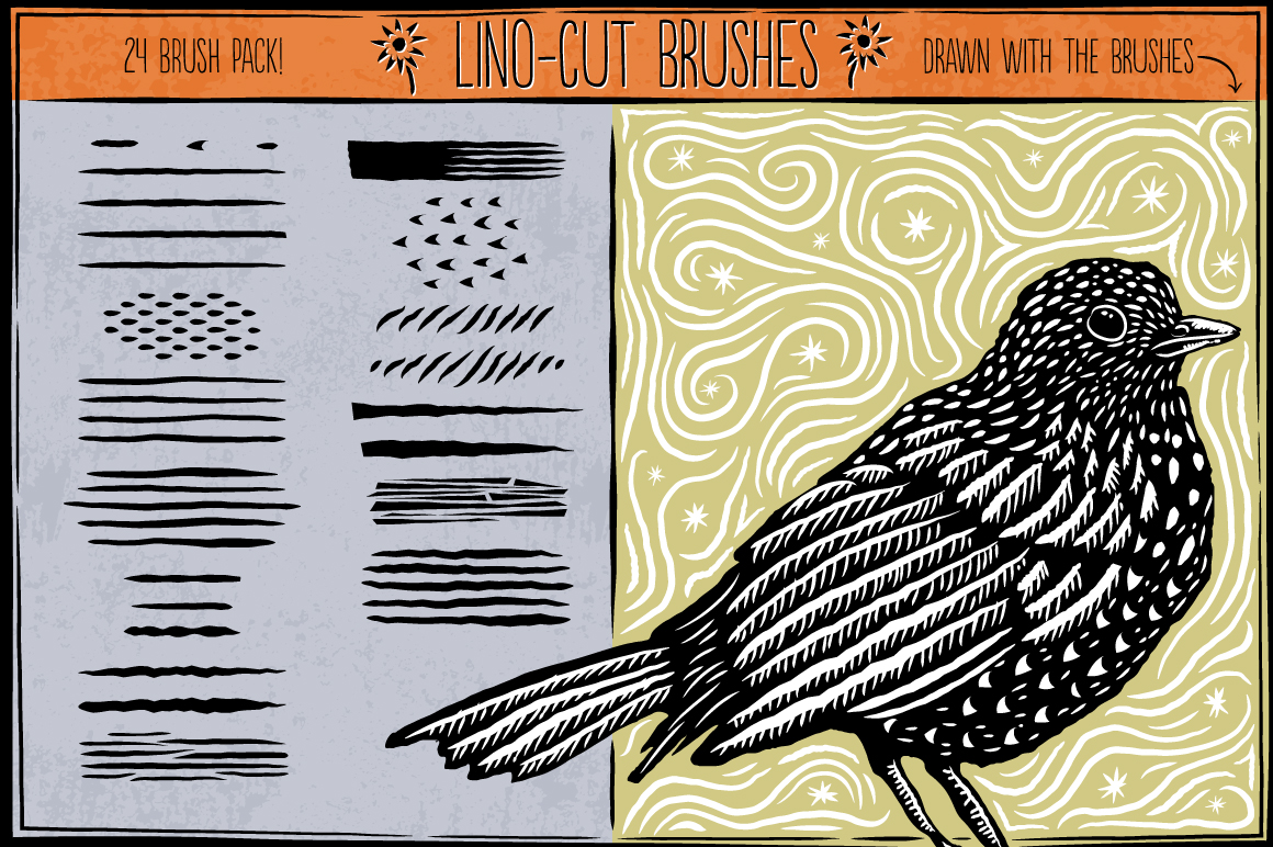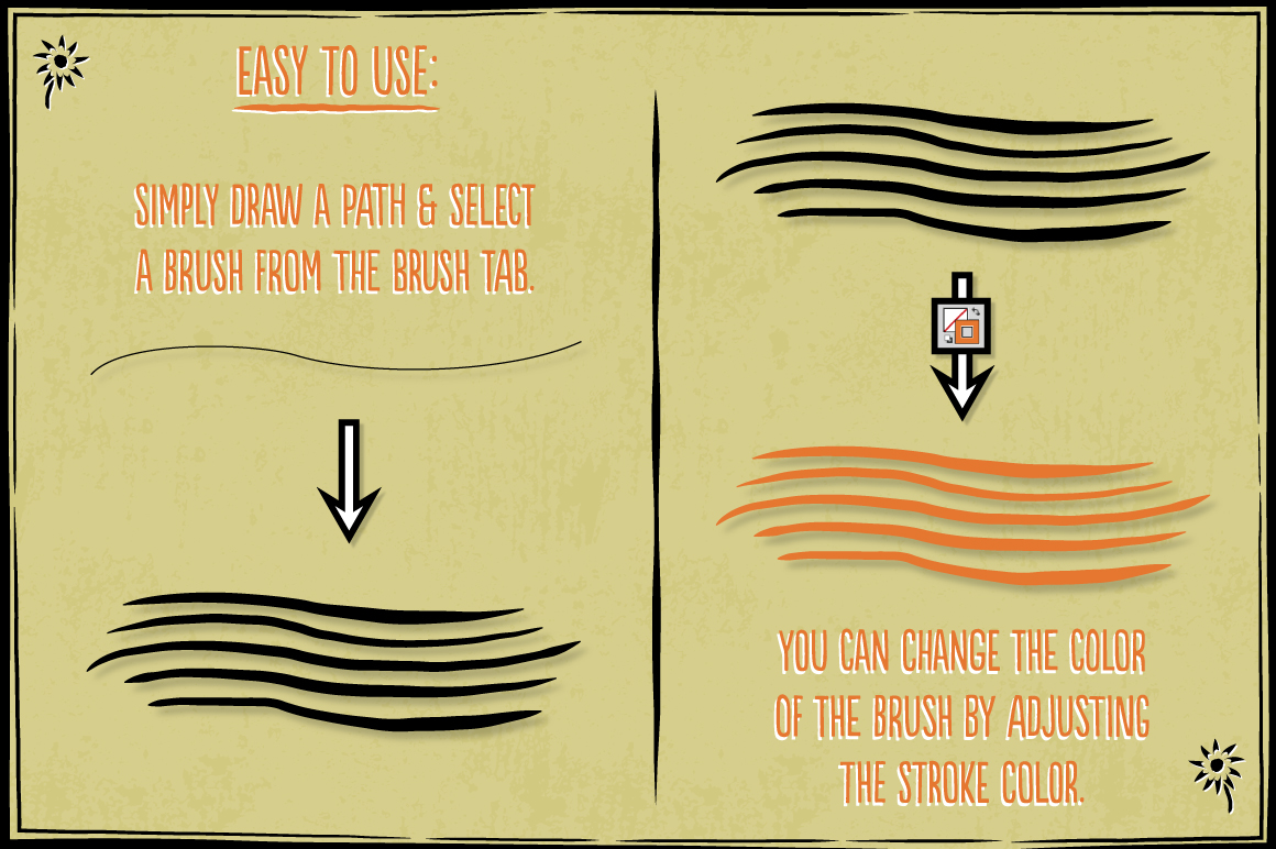 Add a touch of realism to your vector art with this set of 24 linocut Brushes! To use the brushes simply draw a line with any of Illustrator’s drawing tools then apply the brush by clicking on an icon from the brushes tab. The color and width can be changed to suit your needs. The preview was drawn using the brushes. Be sure to view the full-size preview to see the detail! Compatible with Illustrator CS1+. Easy to use – comes with instructions.