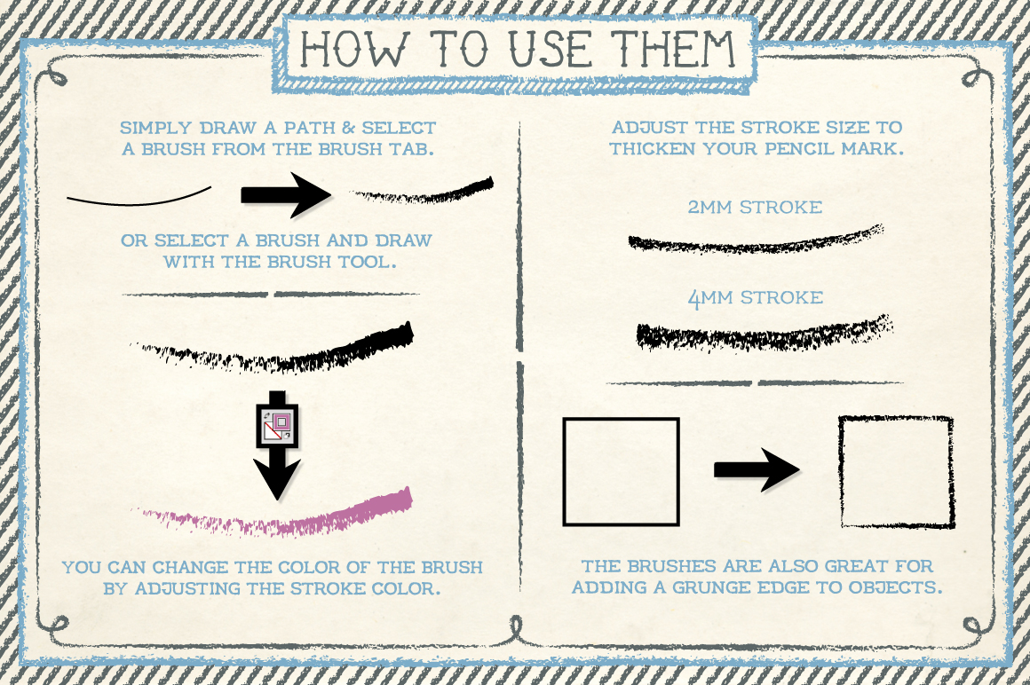 Sketch like and artist and add a hand-drawn look to your designs and illustrations with this set of 30 art brushes! Each brush was made by scanning a real pencil stoke then carefully converting it into an Illustrator art brush. To use the brushes simply select a brush from the tab and draw with the brush tool. The color and stroke width can be adjusted as required.