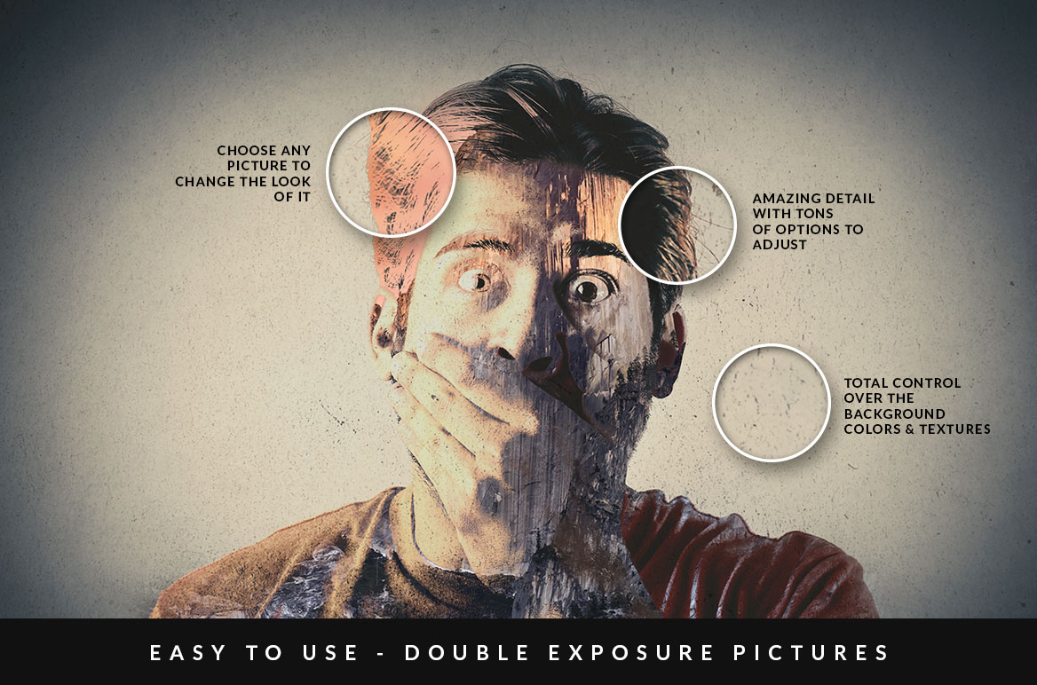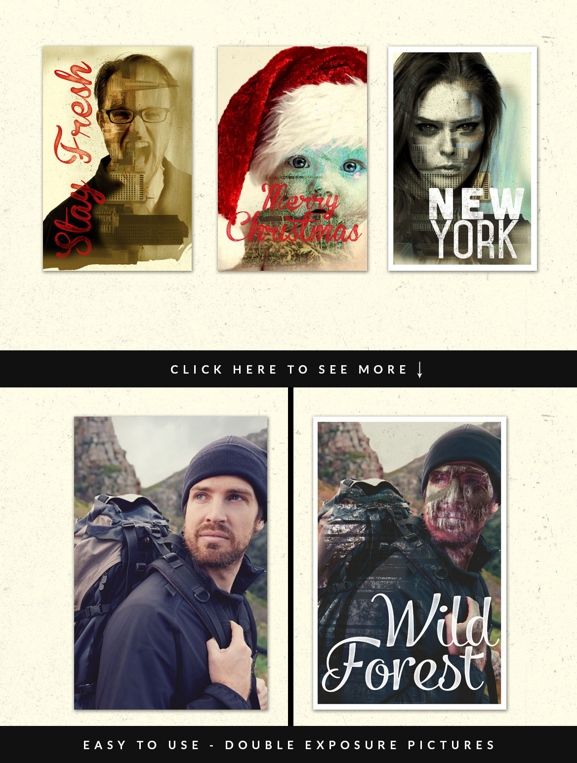 This is an easy to use kit of everything you’d ever need to get great looking Double Exposure effects for pictures, really fast and easy. I love Photography and specially when you get creative and crazy with your pictures. But let’s be honest here, getting an effect like this on a real set-up is really hard and takes longer than you think and many hours in Adobe Photoshop, Adobe Lightroom and Adobe Illustrator. Now you can do that quickly and easily with Double Exposure Kit. The way it works is with smart PSD (Layered Photoshop Document) set up so you all you have to do is drop in your photo and it instantly turns it into a Amazing Double Exposure Picture with total control over your effect, editable text with it’s own rough texture and more. Check out the video run through to see how to produce the effects in just minutes. Video demo here: http://youtu.be/hY4pQkh-u4A