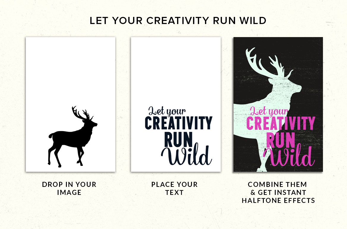 Have you ever wondered how some designers produce such awesome Halftone textures that you see on dribbble and Instagram? Start creating your own Halftone textures and create amazing piece of art instantly. Now you can create all this with my new easy to use Halftone Press – smart PSD. Add one or two layers of work and get realistic inconstant texture effects in just a few clicks.