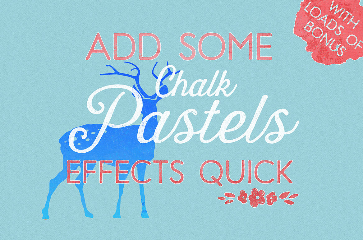 Make your work look like it’s been handmade with Chalk Pastels. Specially for Wedding invitations, gift cards, etc… you name it! All this with my new easy to use Chalk Pastels ToolKit smart PSD. Add one or two layers of work and a multitude of different textures and get realistic Chalk Pastels effects in just a few clicks. Use 12 Premium Handmade Chalk Pastels textures and overlay, PLUS 12 Free textures and gradients. Requirements: Photoshop CS4 or above.